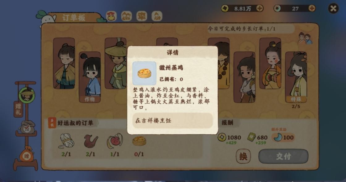 今天的乡长要徽州蒸鸡,但他要求低,只要丙等的……然后我的满级了,做了4次做不出丙等的,希望官方优化一下,其他等级也能提交订单:)
