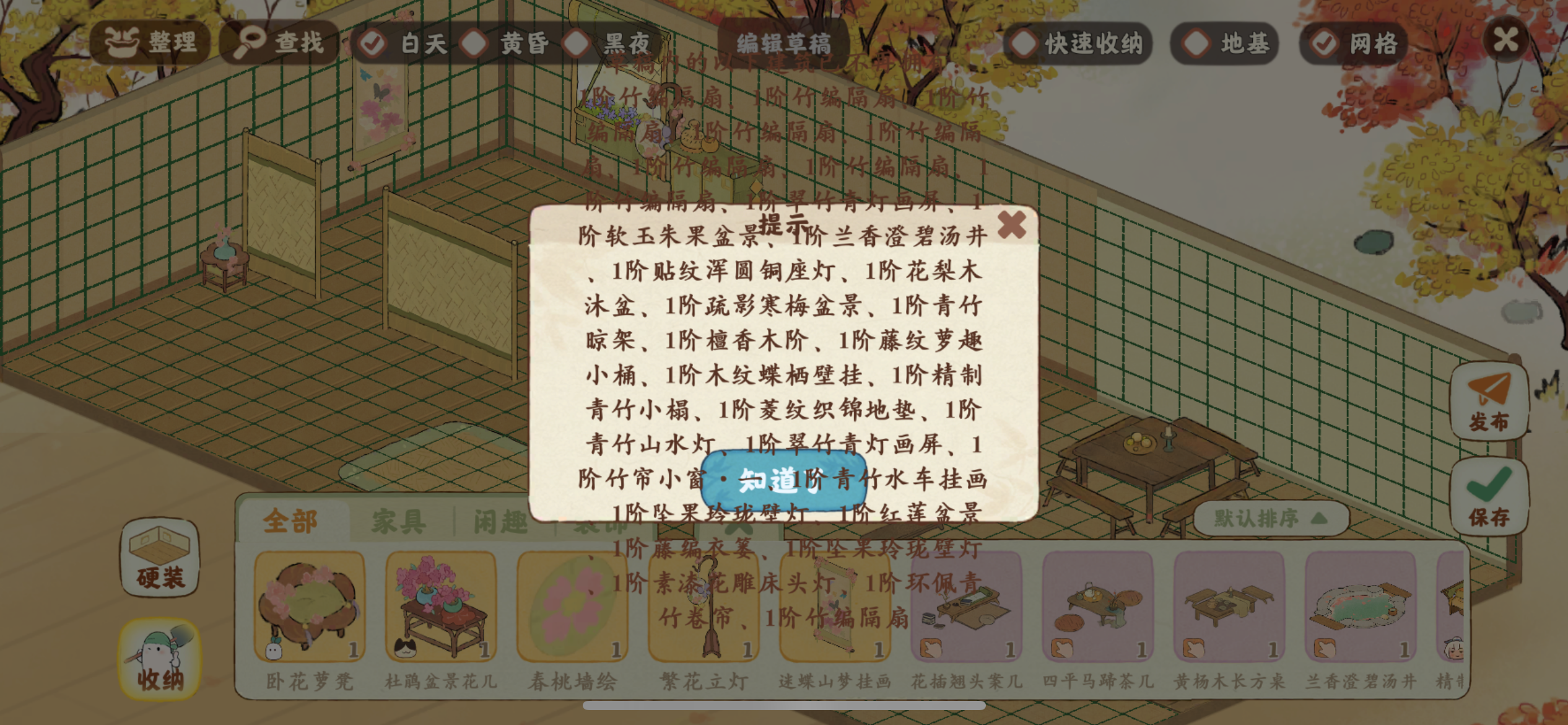 造景保存了之后,想再进去修改,结果提示部分建筑已不再拥有豹哭豹哭相当于前面白造了……然后我重新再摆了一次,退出去再进去又不见了……退出重进游戏还是这样,好难受啊啊啊啊啊……本来一小格一小格的看着就费眼睛嫌弃嫌弃嫌弃摆了三五次直接冒火了…… #桃源深处有人家 #桃源周年庆