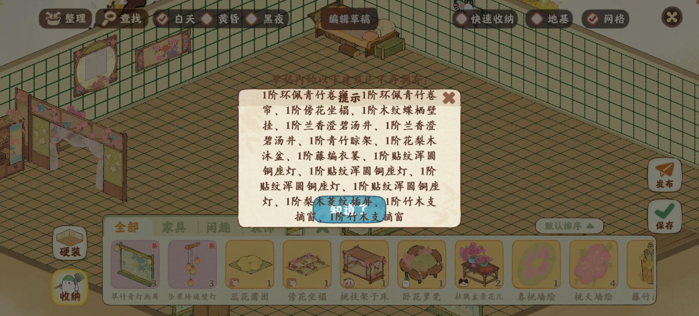 小屋内部的造景搞到一半,发现东西不够用了,想回家再制造一点,明明已经保存在草稿里了,结果再进去跟我说草稿里的东西没了??!又要重来一遍??什么情况,是bug吧!
