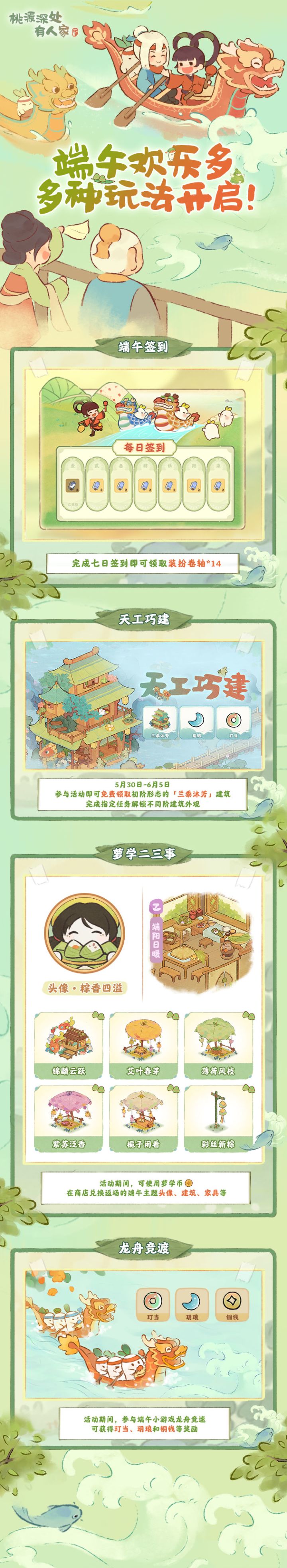 “粽”要消息!端午节到啦,小花贴心整理了一波端午活动,快来看看吧 !签到即可领取卷轴;参与【萝学二三事】活动,可兑换返场端午主题头像、建筑、家具;参与【天工巧建】活动,能领取「兰黍沐芳」建筑;玩龙舟竞渡小游戏,还能赢取玎当、玥琅和铜钱等奖励!粽香飘满萝萝山,小花已经迫不及待要和山民们共庆端午啦!#桃源深处有人家 #端午