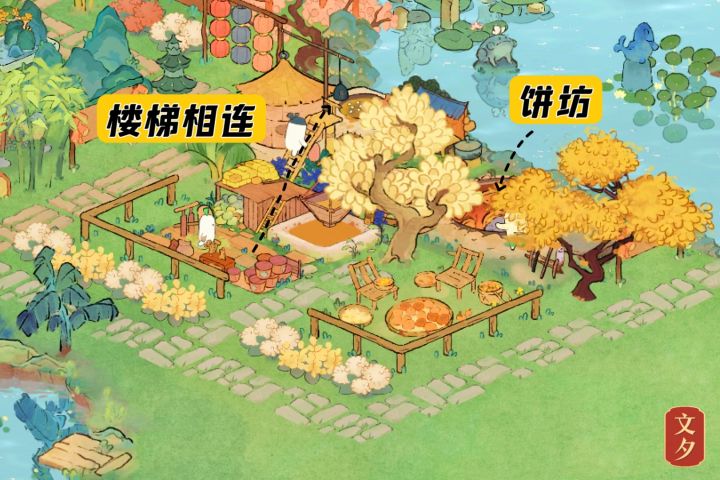 🌷【豆腐加工&土料&饼坊】布局思路:土料和豆腐加工厂的楼梯可以相连,饼坊旁边的枯枝不太好看可以藏在后面用树遮挡。