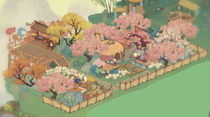 欢迎大家来到我的小家,咱家布局主打的就是一个工作娱乐两不误,尽心尽力打造城市中花园,花园中的城市。首先看到的篱笆小院,主打黄色系。图一。左手边,是订单派送。由总仓库派出,青鸟送达。萝萝平时还可以拜拜猫神,也可以和好朋友聊天休息。右手边,是木场主题,伐木制作两不误。萝萝还可以在工作之余满足自己爱好。下面镜头给到这边,分三个区域。图二。哥哥和好友吃过饭后,还可以在摇椅上歇歇,也可以约上几个萝