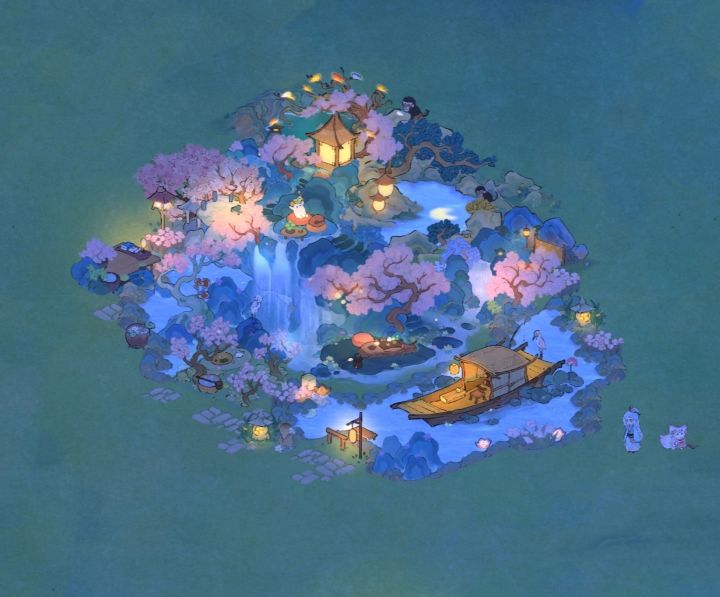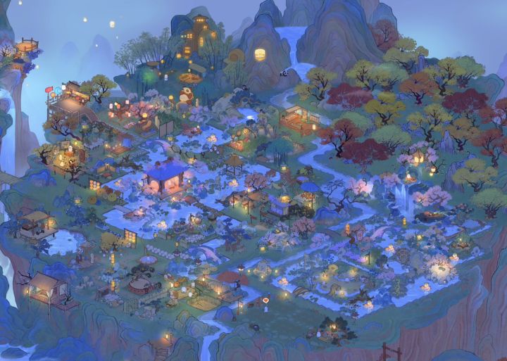 梦中的江南水乡,就是潺潺流水与泥土沁香的结合。夜晚的星光与小院中的荧荧灯火相辅相成投射出的是我心里的静谧之光。一条停靠的乌篷船,绝对的点睛之笔,这就是温柔的江南水乡。小萝卜们或嘻戏,或忙碌,甚至还有可爱的小表情。陶渊明的桃花源就是这里!#桃源深处有人家#桃源深处有人家布局展示