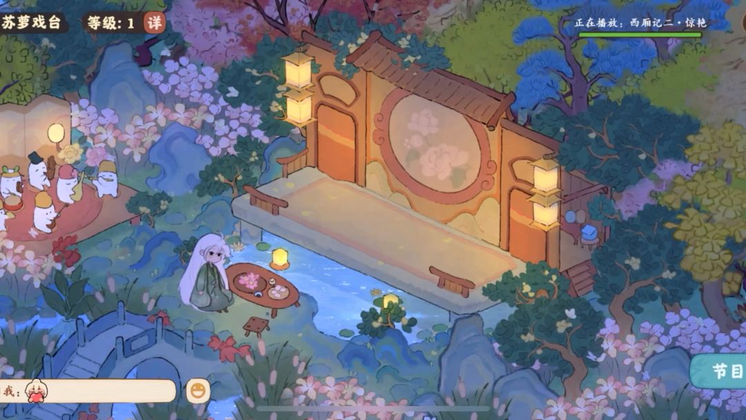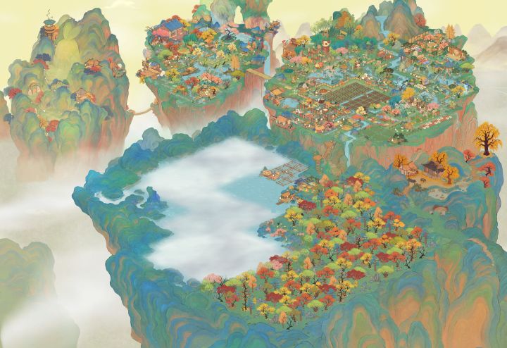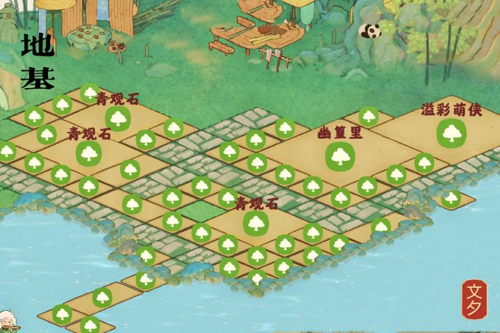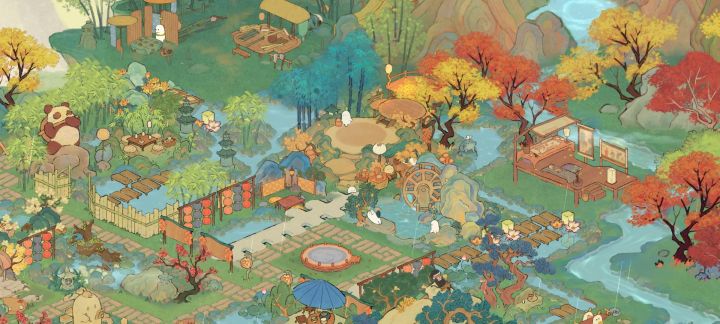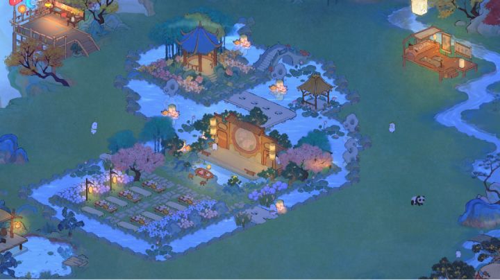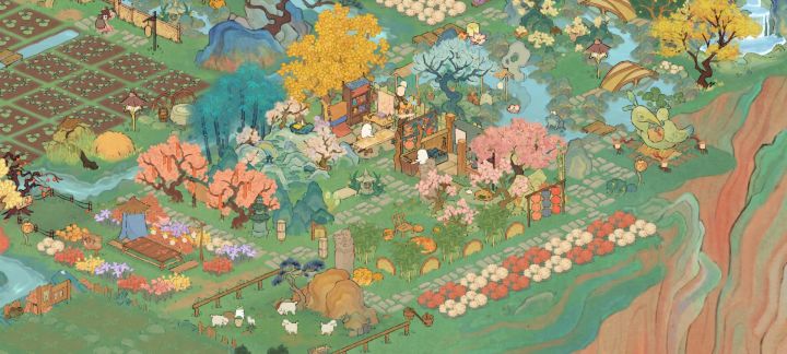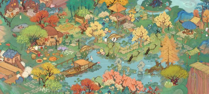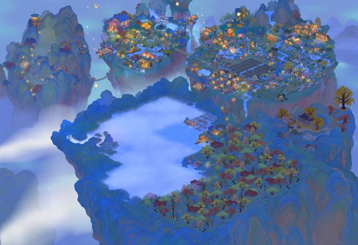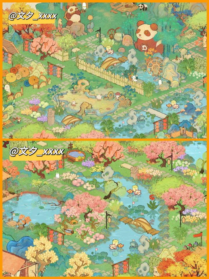 (我的非酋属性限制了我的想象qwq,要不是桥不够我想全挖成水域。)我的思路是这样的:深山里有一个不起眼的小瀑布,瀑布连接着隐蔽的深山里的小溪、水潭和湖泊,岸边有一个篱笆小院儿,院落里种满了桂花树。院子的主人是一位白发苍苍的老渔翁,他会在下午的时候披上蓑衣提一盏灯,哼着奇怪的调子撑着自己的渔船去打鱼,夜幕来临时才归家,他还在湖泊里种满荷花,有兴致的时候就会采集荷叶和露水烹茶。老渔翁以自己家为