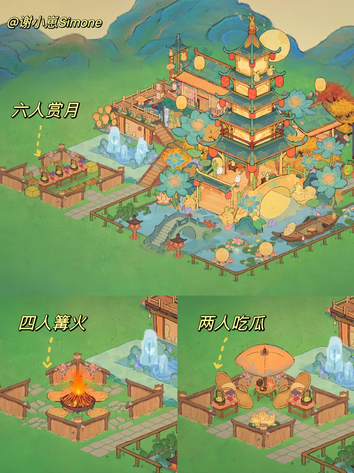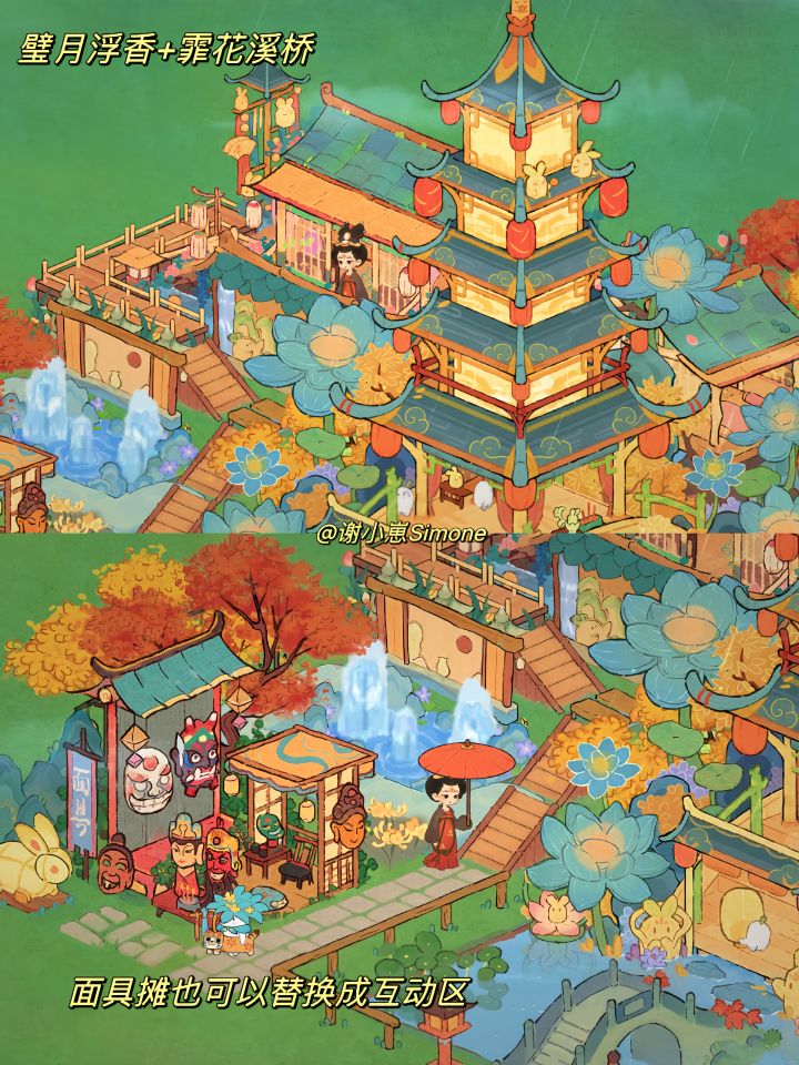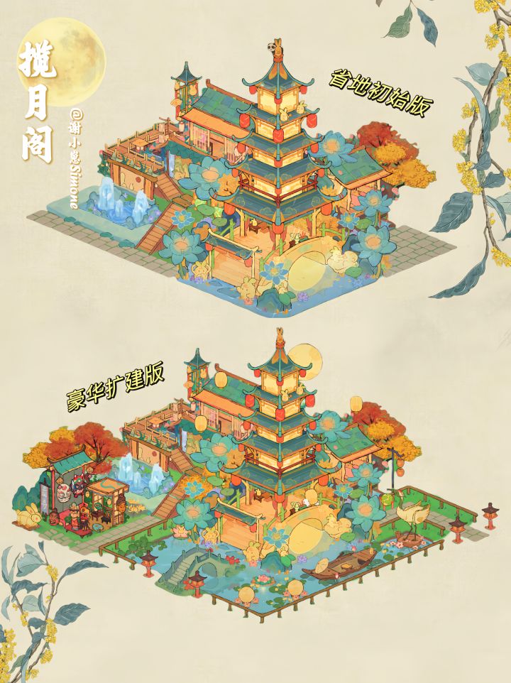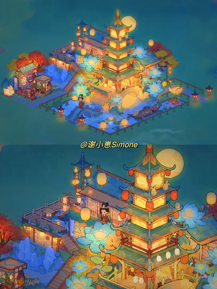 耶,终于把中秋元素的建筑搭配好啦,我自己感觉还是不错滴嘿嘿,白天和晚上都好看,但是我仙女湖还没开完,等开完就把它摆上!