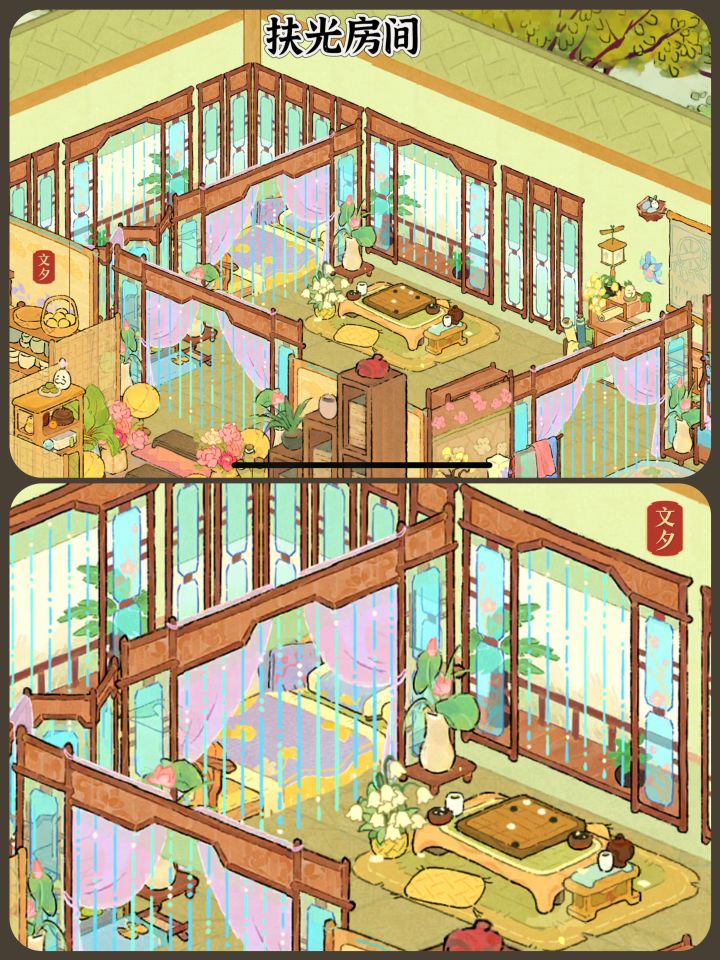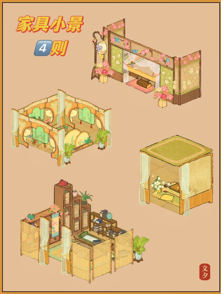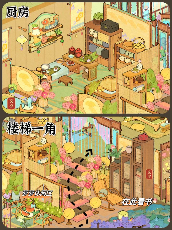 有借鉴其他玩家的,借鉴出处在最后两张(图五和图六)!整体来说包含萝的爱好以及农家小院,小景。图一是整体。图二是外卖订单。图三是萝小晾。图四是萝小豆。图四是其他工坊。