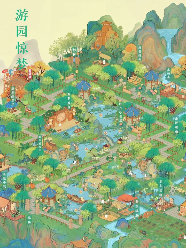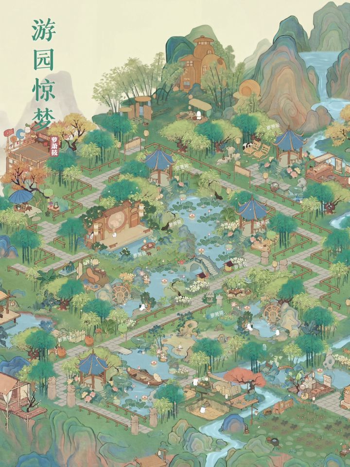 桃源丨「游园惊梦」二岛园林布局•很喜欢的「苏萝戏台」有了属于它的园林布局,戏台和牡丹亭很符合主题,「曲水流觞」在园林里也有了灵魂。•P9饱和度调低感觉比较古风一点#桃源深处有人家二岛布局#桃源深处有人家#桃源深处有人家布局展示#桃源深处有人家装修