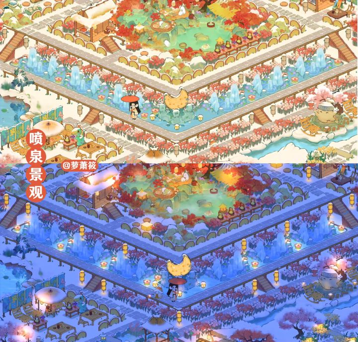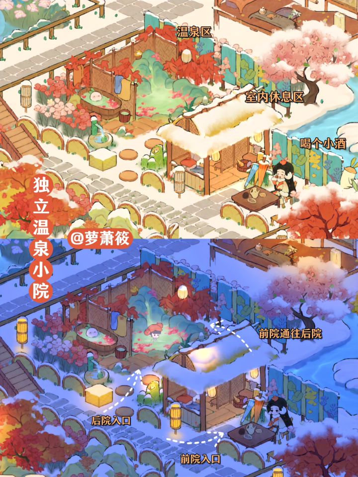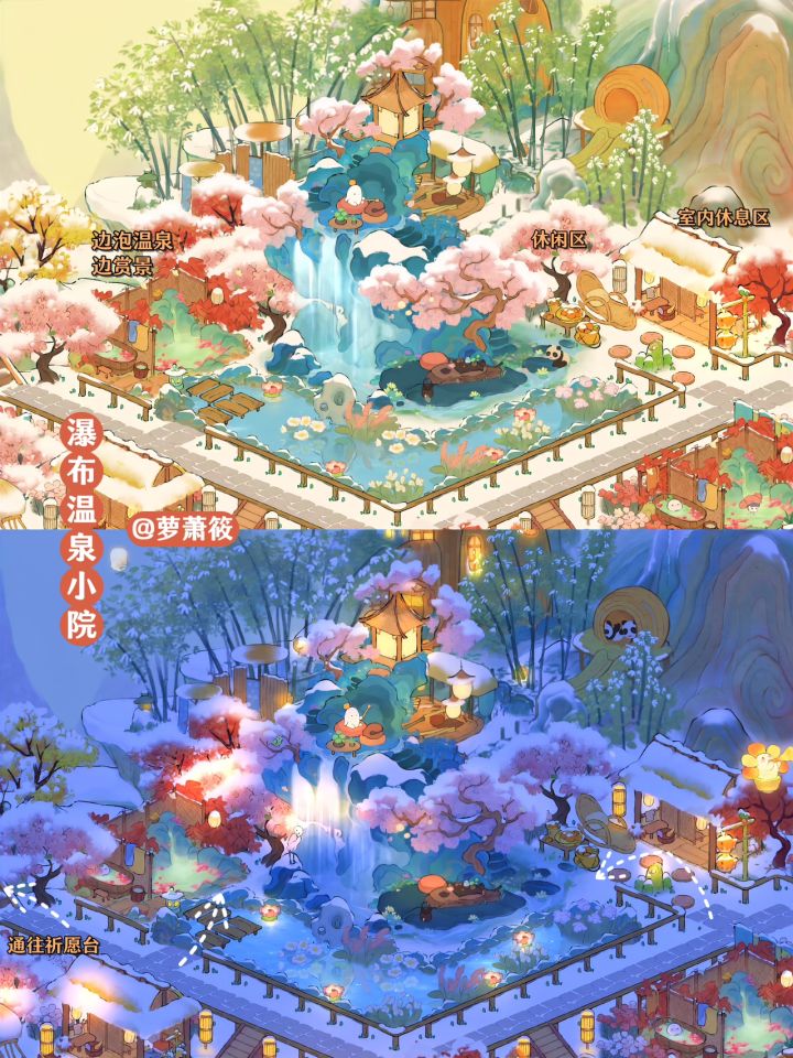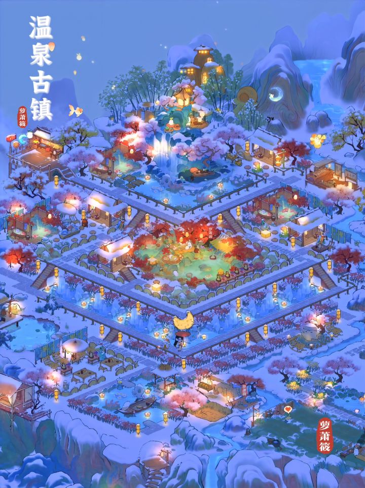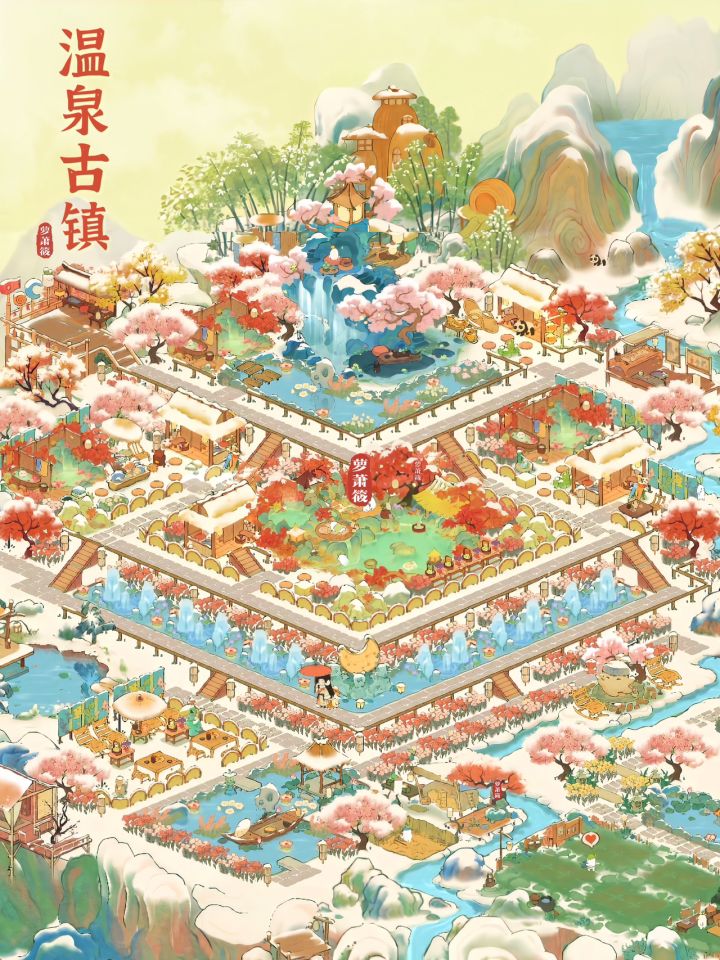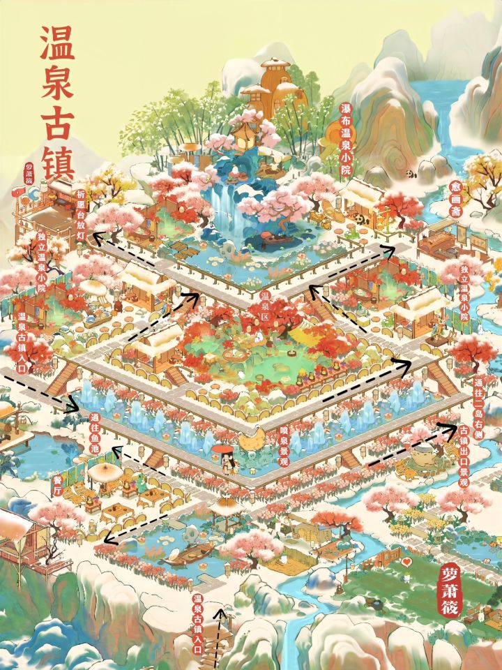 桃源丨一座恬静如画的「温泉古镇」 🌸布局框架延续了「云梦莲花坞」的立体对称布局🌸「温泉古镇」设有三个独立温泉小院,一个大温泉区;古镇有瀑布、喷泉、迎客雕像景观;有特色餐厅;尽情领略温泉古镇的独特魅力!🌸主要建筑:红枫暖泉 水云静栖 红叶花浴 涟舟轻荷 有客远方 湖心亭 星莹月赏 沐衣香斋 栖花喷泉 丹枫亭🌸蒲团小路创意来源:小红书@谢小患 Simone🌸抄作业随意,如果发布平台记得@我就