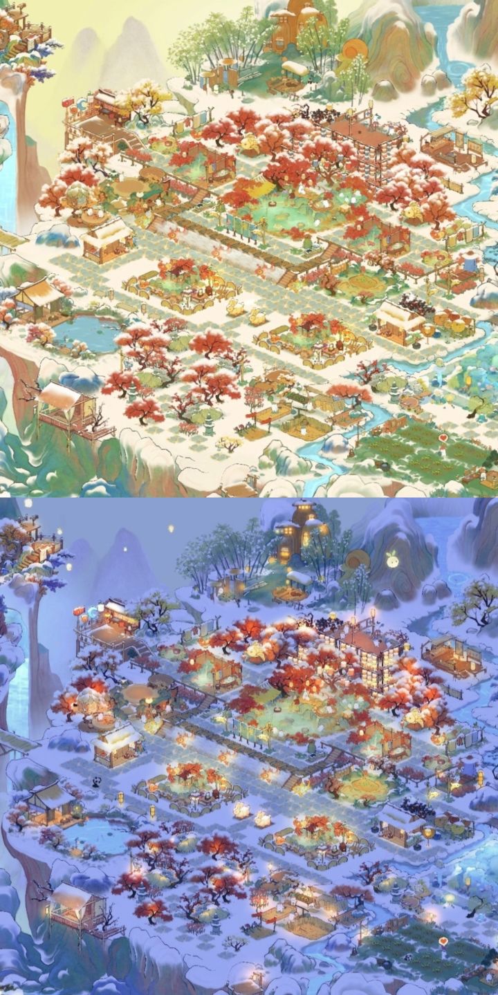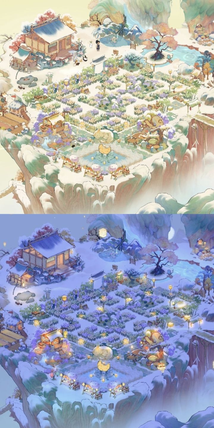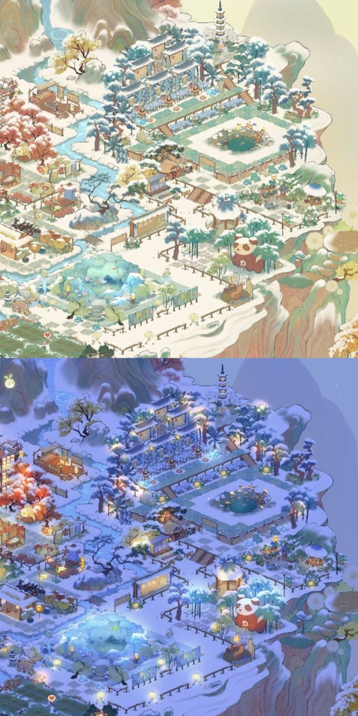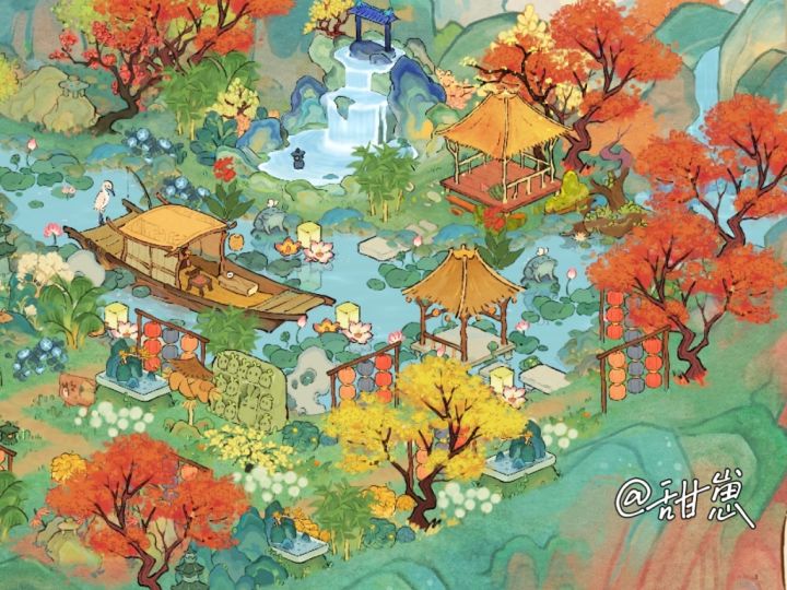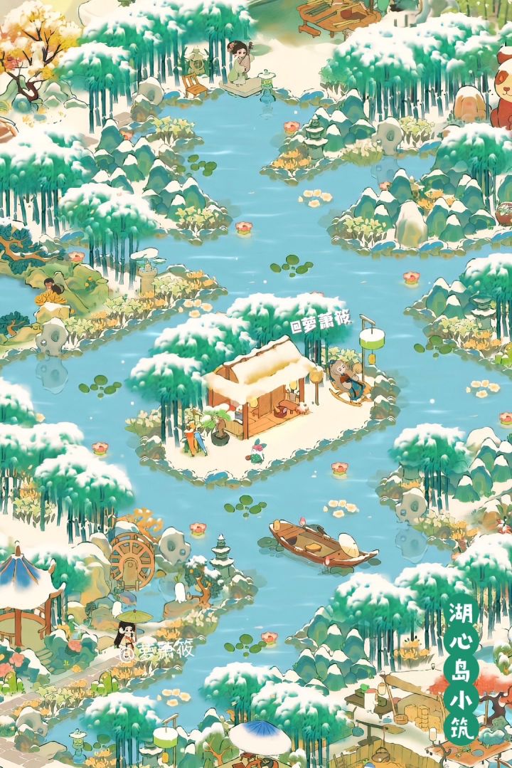 在此之前总有一个岛在摆烂……现在!终于!装全乎啦!我的一岛是个小迷宫,想要进我的山头,就得先过我的迷宫!(哈哈哈)我的二岛是冰与火主题,红色区域是不夜城温泉,蓝色区域是“冰泉鱼池观赏园”和求啥啥灵的“蝶语寺”~~~仙女湖及三岛汇集了所有工坊和配套娱乐,还有田地。超级满意qwq