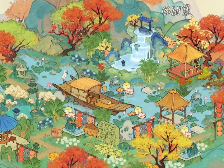 🌿时见归村人,平沙渡头歇。🌿哈喽哈喽!我来分享一下我的参赛作品!哈哈哈!目前还是零氪党,每天空闲时间玩玩,等级也是刚过17级,家具并不多!但是咱们参赛主打一个“陪伴”😜😜🤗设计思路是【码头送别,寄托情思】故事,我脑补的,哈哈哈🙈🙈清澈的泉水从山顶汇聚形成河流湖泊,又缓缓向山下走上去,湖面上一叶扁舟停靠河畔,殊不知在等谁,迟迟不肯出发?🤷忽然间,从远处的林间小路迎面走来一对母子,背着行囊疾步
