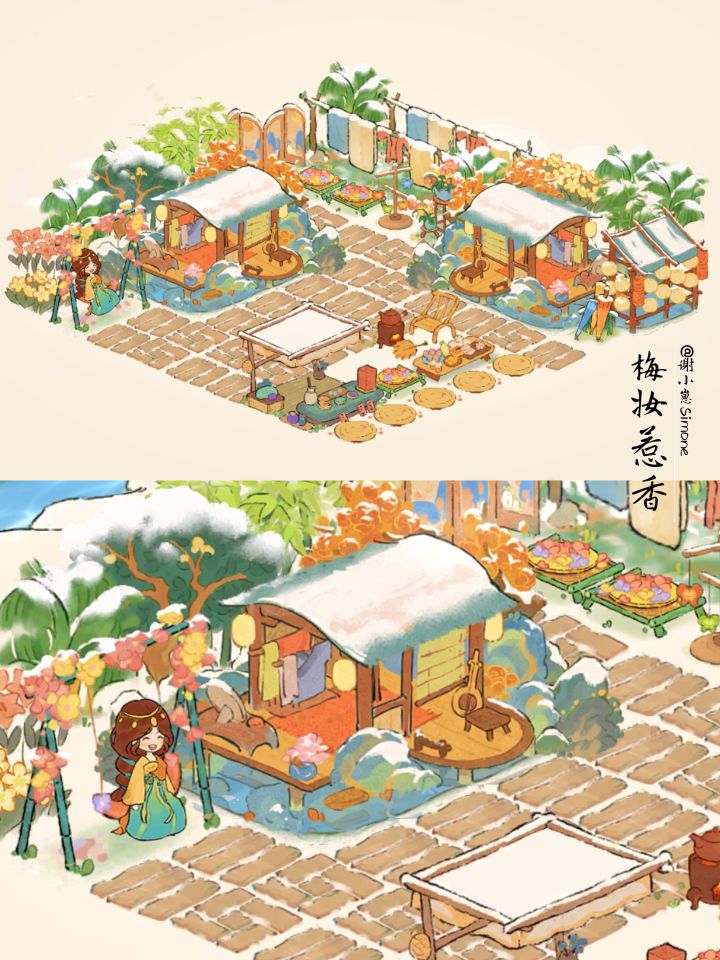 造景编号:wz378855(V区)用近期的新建筑搭了一个小景,梅妆惹香小屋子,宇文恺兑换的拂花秋千、晒香架,桃源乡兑换的果酿甜醉~~~非常春天的雪中小景。#桃源深处有人家装修#桃源深处有人家布局展示#桃源深处有人家#桃源深处有人家生活记录