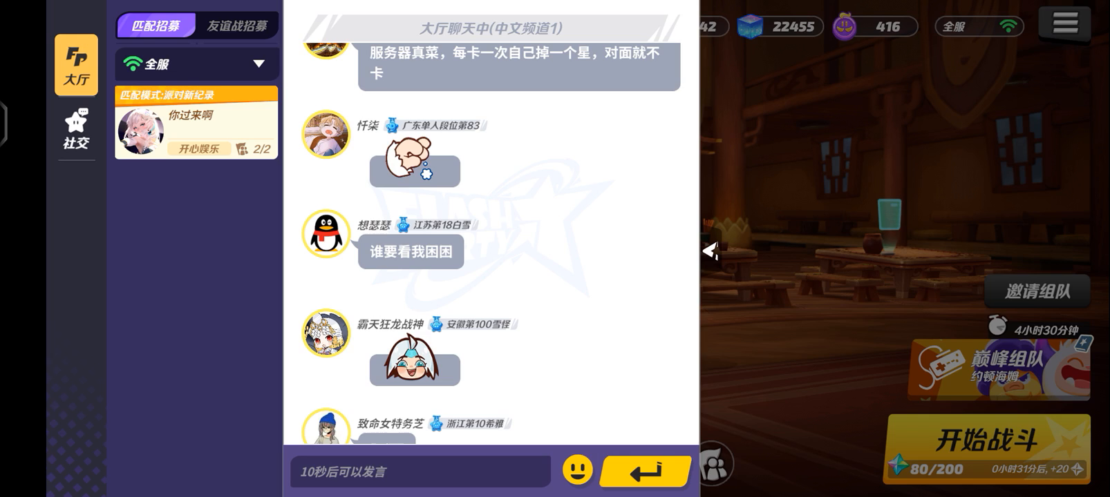 从嗒啦啦送完最后一条命我直接卡住,所以退出去了后面画面是人机打的,重新登陆显示正在战斗然后又加载不进去。