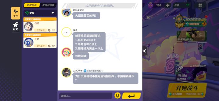 长条弹幕的显示有bug,会遮挡下方玩家的名字还有(不知道是不是bug),在选角界面查看角色详情的时候,只有角色出场动画结束以后,才能双击查看细节。在选完角色的大厅界面,当角色还在出场动画的时候,点击匹配,并不会播放匹配动画,要出场动画结束后再点匹配才会放