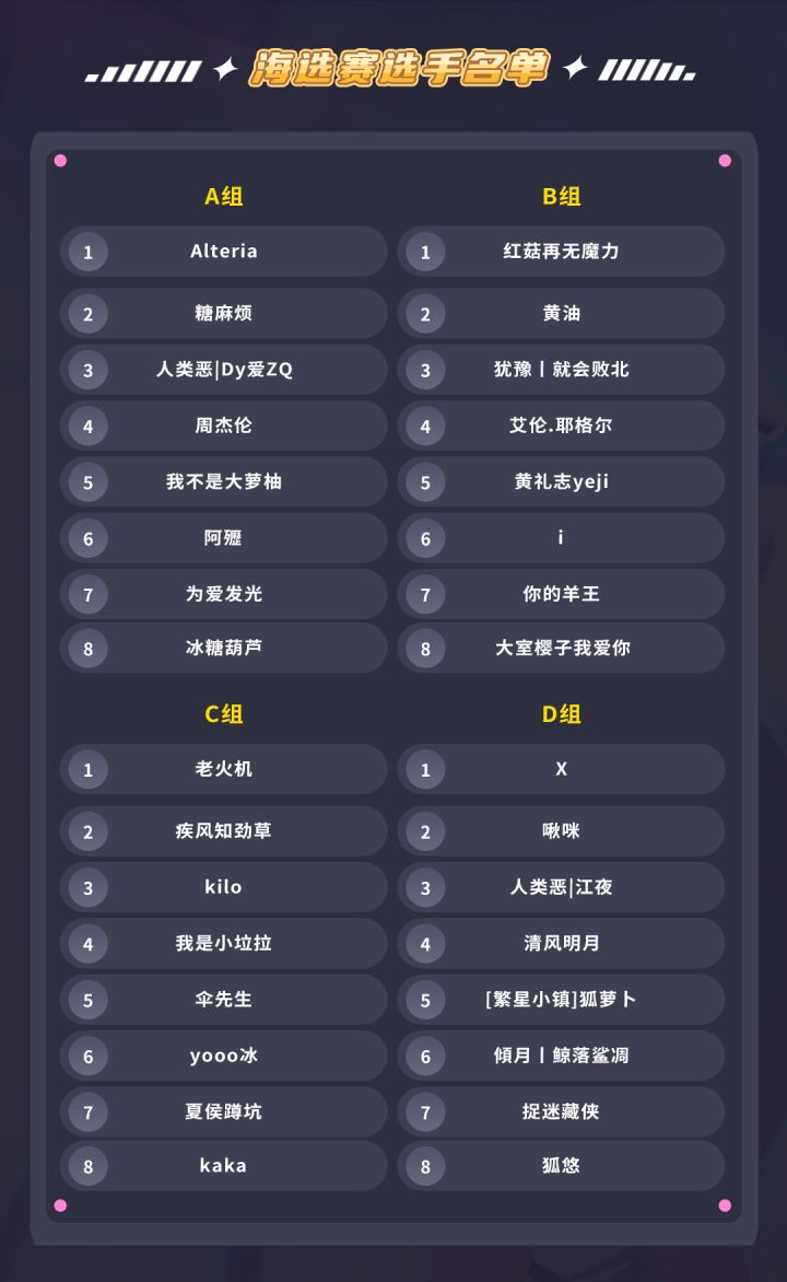 派对之星们晚上好!第一期—皮神对决训练营 即将在6月18日-6月19日 每天19:00开启!成功报名的32位经过8轮的海选比赛,一共会有4位选手脱颖而出,进入到月赛的导师战队赛一起期待他们的精彩表现吧!这里给大家本周32位参赛选手名单~没有进入皮神训练营的玩家也不用太担心哦~在下周我们还会开启进行其他训练营的报名!>>>A组<<<>>>B组<<<>>>C组<<<>>>D组<<<实