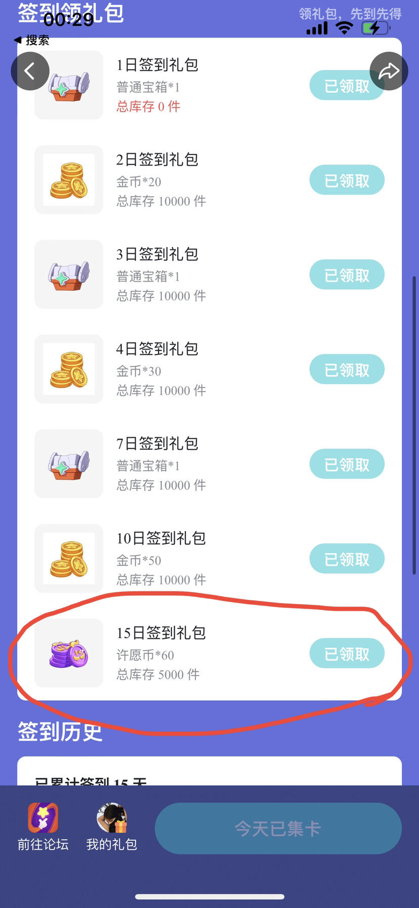 漏签到了2天吧,反正今天是拿到了 60许愿币,稍微攒攒又够下个赛季买星光卡了。每天都有玩的小伙伴别错过了签到。奖励还是相当不错的。