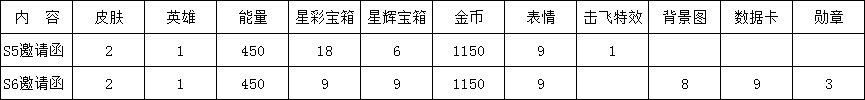 邀请函变更的争议挺大,我做了个统计对比表,仅对比邀请函附加内容,星彩箱子和星辉箱子的数量、能量的数量复核过没问题,其他数据可能会有误差。S5赛季邀请函附加内容折合成普通箱子18*3+6*10=114箱 S6赛季邀请函附加内容折合成普通箱子19*3+9*10=117箱S6赛季对比S5赛季邀请函附加内容:折算普通宝箱总数多3箱,击飞特效少1,新增背景图8,新增数据卡9,新增勋章3。