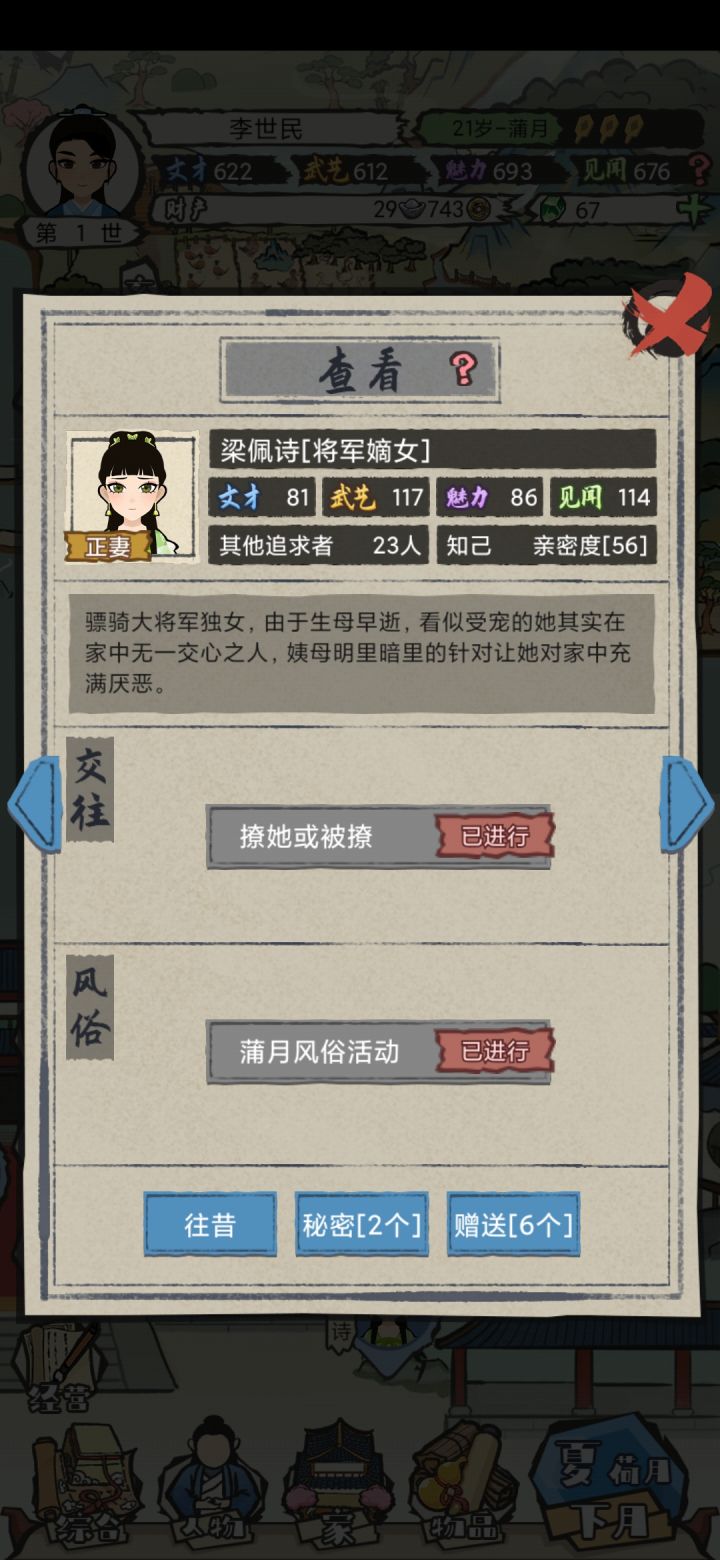 稍微整理了一下论坛里大家提到的问题,和我个人想提出的优化提议。大家有什么新想法随时在评论里补充抒发呀!大概会随深入了解了游戏之后更新这个意见贴1.生计赚钱主要来源四十岁以后最高职业为私塾先生(1银元600铜币)其实赚这些是不够的,一个子女出游一次最低就是1银元,养的孩子多了根本入不敷出2.呈上文,四十岁以后新人物新职业略显空档(新人物登场时间五年为期太长了)导致日程重复无趣3.添加更多家人系