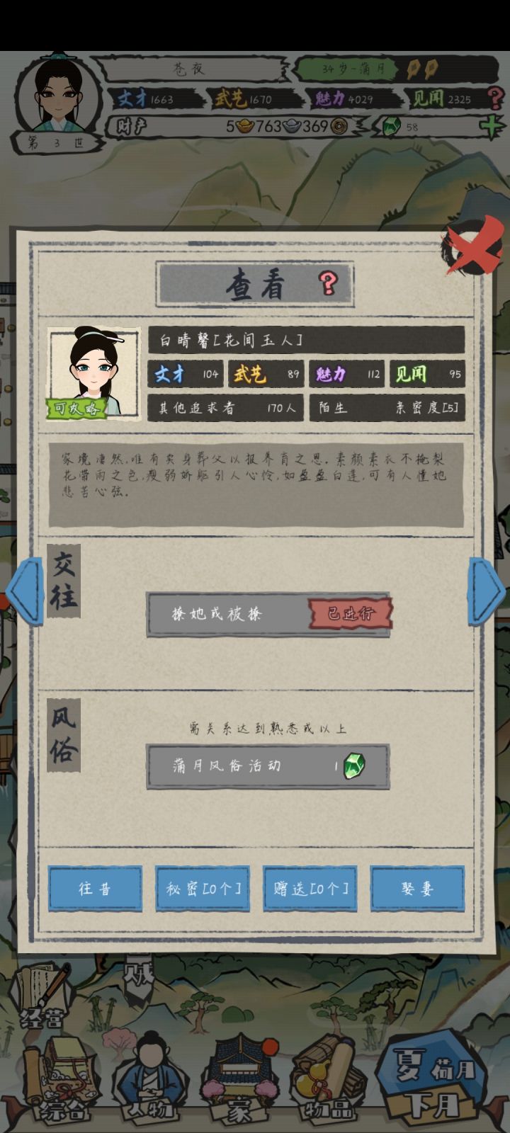 玩第一世的时候真的很惊艳的,很喜欢,娶了好多妻妾,导致第二世没有很大兴趣继续攻略重复角色,就没怎么娶妻。一世活得时间短,就会有很多事件没解锁,也没有很多机会进修(只累钱财才比较慢)但是一世玩很久,就会比较无聊因为40岁左右,解锁新人物隔的时间太久了,五年才解锁一个,导致这五年期间很重复很无聊,玩不下去了娶妻条件有一些也比较苛刻,好像娶妻跟年纪无关,四五十岁了还可以娶妻(感觉角色没有老一样)