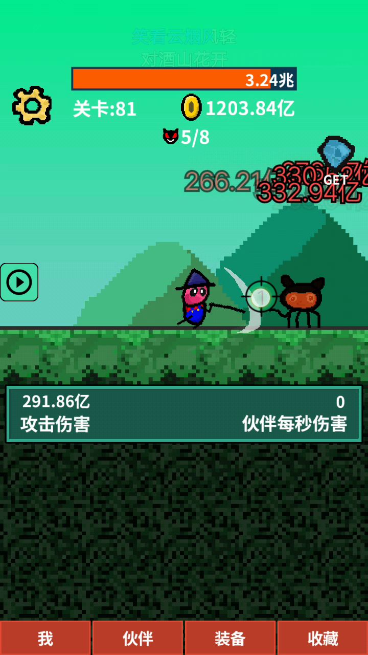大家好,我是天谕熊猫,玩天天打怪升级将近一个月了,游戏给带来了很多欢乐,每次更新都有不一样的感受。好了,话不多说,直接攻略走起。进入游戏我们首先得了解游戏的几种流派,。首先是伙伴流,伙伴有着高额的基础伤害,下限高低,上限高(1.7.37版本目前如此),由于攻速的原因,伙伴流效率并不高,只适合新手入门各种藏品没起来时的选择,或者是点击流到了高层后推关使用,在当前版本不推荐使用,伙伴流装备首先洗全