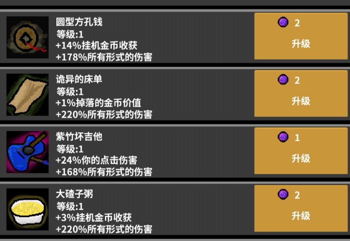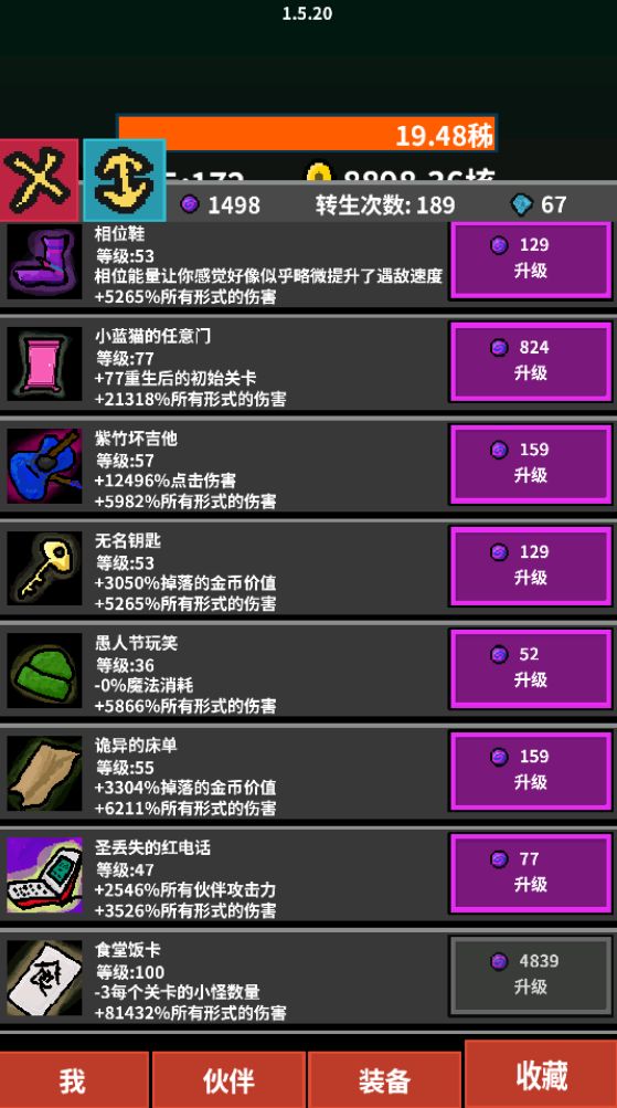 由于上个版本点击流的加强,高层转生的游戏中期的优势就体现出来了。主要的前置神器 :饭卡,相位鞋(相关点击伤害的神器,暴击爆伤,点击伤害的,肚兜,包子,和两个掉落金币价值的),辣条,快乐水,BP机。PS:如果抽到了用不上的神器还可以碎掉。优先升级鞋子 饭卡 ,肚兜,点击伤害,和金币掉落价值。装备金尽量要点击伤害,暴击率。因为增加暴击伤害神器的数值比较大,爆率的装备优先级大于爆伤。(饭卡减怪的是