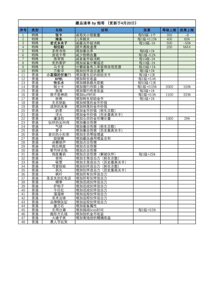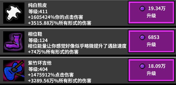 开头先领兑换码,传说武器,武器可以洗属性 升级加伤害 藏品开头先抽 重要的有夹子 门 快乐水 辣条 骑士卡 bp机 饭卡 鞋子点到121好像就行了 账簿加利息 其他看着办 甜甜圈我觉得不错 钻石就先点银行 (快速转生十次) 存精魄 每小时结算 然后慢慢玩大碴子粥可以加离线精魄 看自己保不保留150级前特殊藏品(比如饭卡 这种有上限的)和普通藏品(bp机 门 还有别的)差不多贵可以看出其他好像都比不上这直接的熊皮 吉他 (加的伤害是一样的 应该没什么差别)