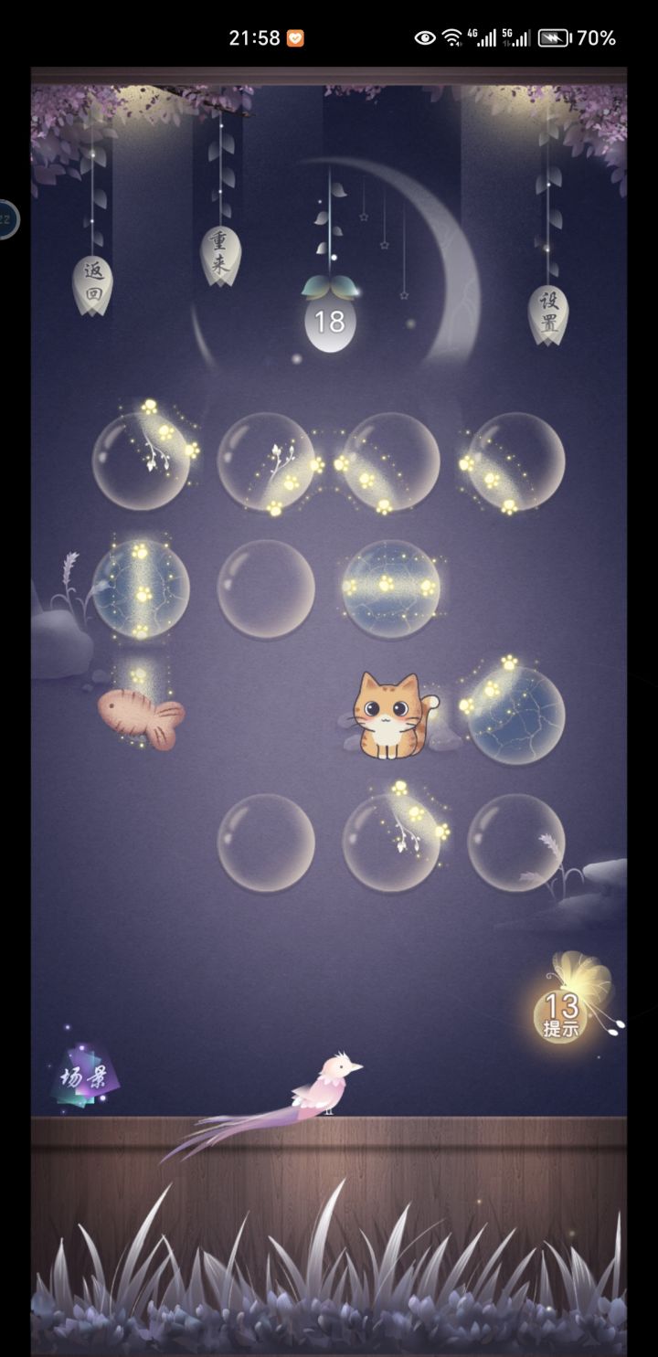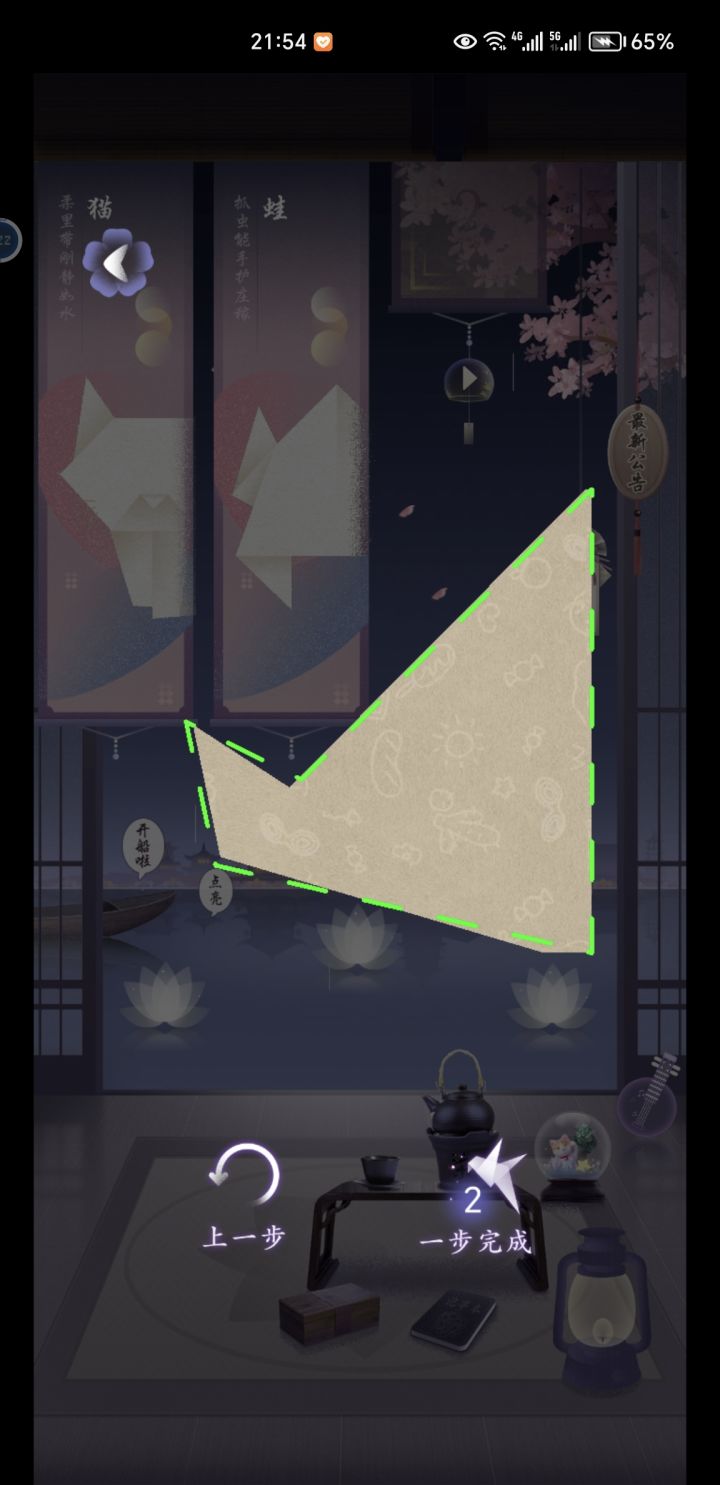 刚开始进游戏的时候我也一脸懵来着,不过越挖越多,还挺有意思的一进去就是就是图一的界面 左上角特别大的卷轴就是折纸了,寻梦那个是类似华容道的连线游戏,湖面上的三朵莲花是猜谜,船是翻绳,屋子里地上木盒是茶包,目前不清楚具体使用效果,本子是笔记,可以随便写点东西,油灯可以点亮或者熄灭,雪景球是打地喵游戏,就记住喵爪出现的位置,划过相应的洞口(但毛球不划),那个乐器(阮?)是音乐开关。茶壶是茶屋入口,
