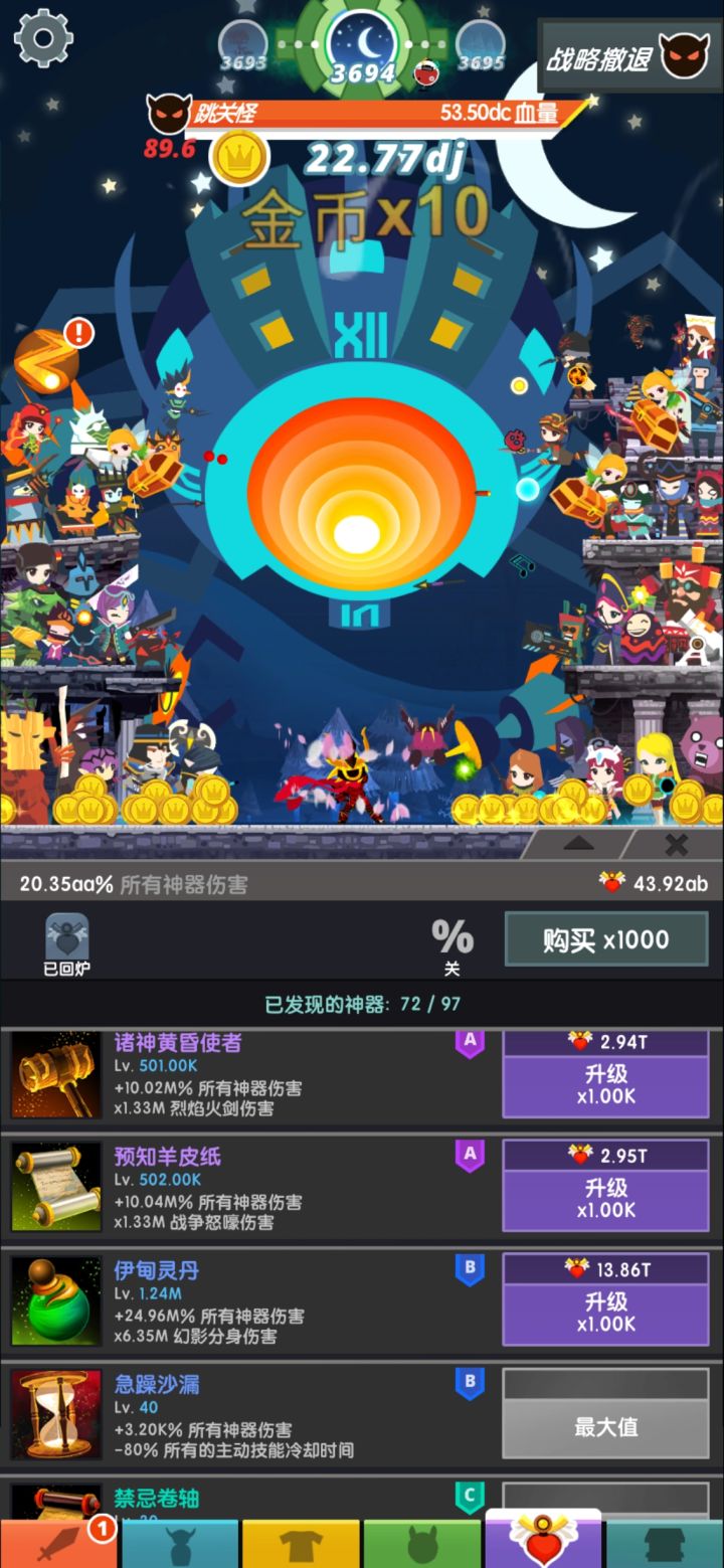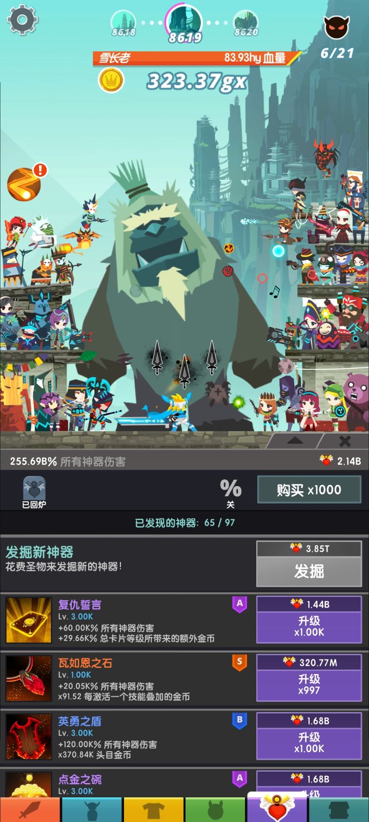 我升级神器都不想升了,点得累死了也没加多少,点一次就加0.02。而且我圣物加半天都没动,加1000级太少了吧,10000我都觉得不够