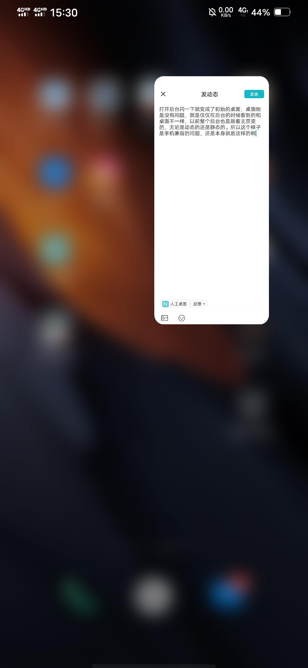 打开后台闪一下就变成了初始的桌面,桌面倒是没有问题,就是仅仅在后台的时候看到的和桌面不一样,以前整个后台也是跟着主页变的,无论是动态的还是静态的。所以这个样子是手机兼容的问题,还是本身就是这样的啊