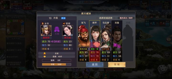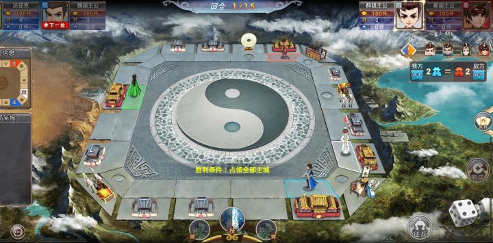势力魏,开局群雄走到魏主城,直接攻城,吕布阵亡,魏主城也没什么兵了。魏第一回合走到税收那里,所以主城有钱。蜀第二回合走到魏主城轻松拿下,不占城,拿钱招兵,第四回合走到吴主城轻松拿下,一圈没走完就这样输了。