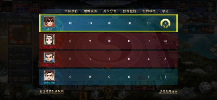 虽然说现在我也可以玩的很好,但是我其实有很大的吐槽欲望。就是为什么两军相遇不会争斗,两波大军踩在同一片土地,怎么可能没有争斗,我希望在投点数之后,如果遇到敌军会相遇,也如攻城那样,只不过没有交税,用随身的将和兵进行斗将和战争,这样游戏的节奏可以快一点。当然这个想法也不是空穴来潮,是有其他的大富翁类游戏有这样的设定的。不然我现在有一小半儿都是等游戏结束才能获胜。就比如说我截图这一次,别看我是得了50分,那是因为我恰好的最后一回和把他们全灭了,不然就是一个拖到结束拼谁城池多的时候了