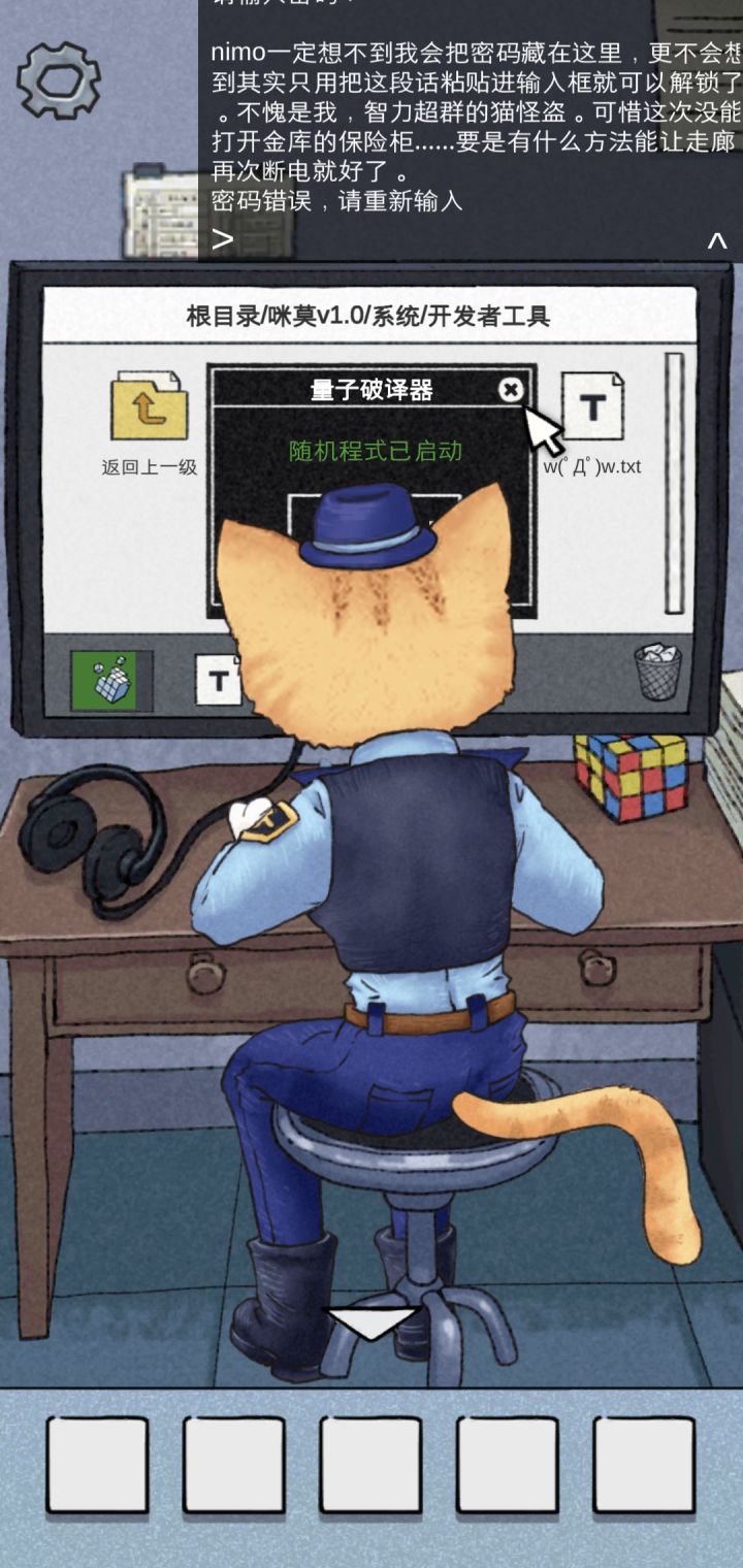 * 按照攻略内加粗字体可以获得全成就* 到了结局分歧请注意看说明!另一个结局在评论区* 删掉了一部分没啥意义的图片,谢谢指正新手教程完成之后,移动界面,把书摆正,获得小钥匙,打开办公桌抽屉。获得证件,得到编号9527。点击电脑开机键,输入警号9527,看到邮件中预告函说要去喵啼银行。办公桌右侧墙上挂着地图,看到喵啼银行在I9。点击办公室外停的警车,移动坐标去往I9。到达目的地,此处直