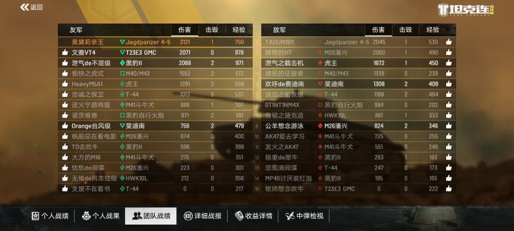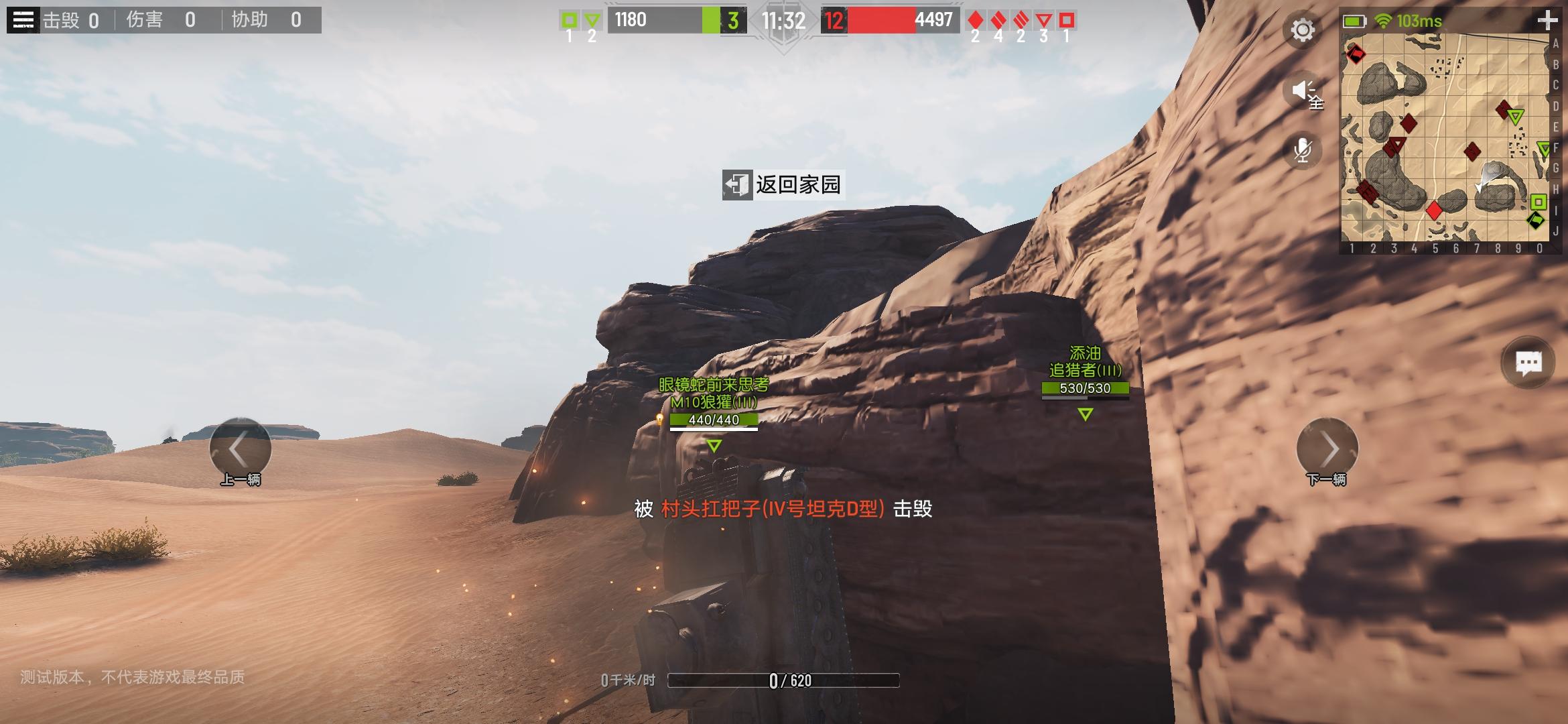 游戏时间太短,完全没有策划认为的那种30人战争感觉。像我第二张图,这是我玩火炮时感到实在太无聊截的。这时候另一辆火炮已经赶到地图中间悬崖把卡在那里的坦歼救下来了,两边谁也看不到谁,大概还剩八分多钟的时候就只剩下我们火炮坦歼五人了。游戏打到这里,基本谁坦歼、中坦、重坦多就能赢,像我们这局,只多了一辆残血坦歼,就赢了。火炮在坦歼面前毫无招架之力。