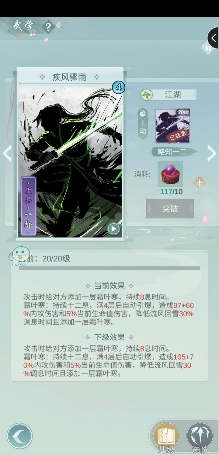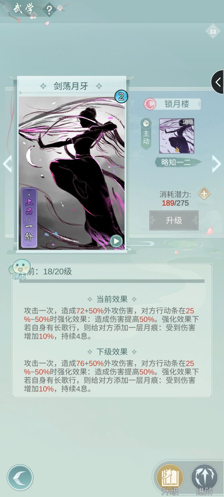 低级萌新的想法,勿喷。首先,先上锁月楼四大上品主动武技图。我在补偿中抽到了这四个上品武技,一开始我是特别贪心的把这四个上品主动武技全部装上,但后面我发现,这四个技能对于卡行动条的要求实在是太高了,而且对长歌行释放时间要求也不低,飞影逐月也不可能像理想的那样轻松打满所有标记,更多时候是东一榔头西一棒子,行动条涵盖全过程导致全程需要专注,分心伤害就低,你一个走神本来可以打过的怪直接反杀你。所以我