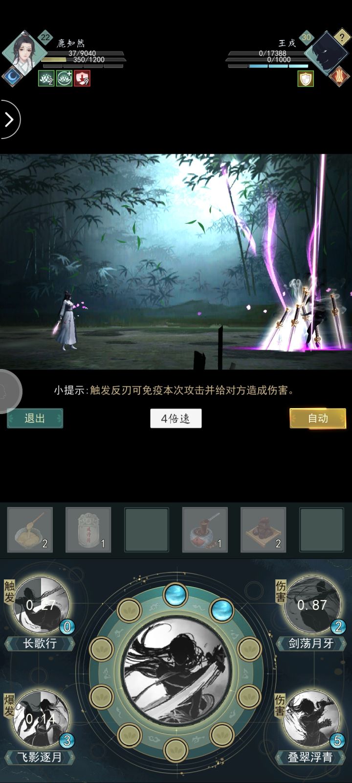 功法基本齐了然后我的配置没有带烟雨岚,我们好好的磨人血,你个4费爆发来捣什么乱,我们要将苟,贯彻到底,因此带了个飞花诀,2费带减攻,一层buff减对方5%输出,最多叠三层,也就是15%?不知道他是不是线性叠加的,有大佬可以测试下,其他三个技能3费,都带50%的附加效果,回蓝,反刃,多一段伤害,这啥都有了啊,反正这套我就是4倍速挂机,挂机打不过你自己上也难……最后说说终结技,我带的劈柴啊,你问我
