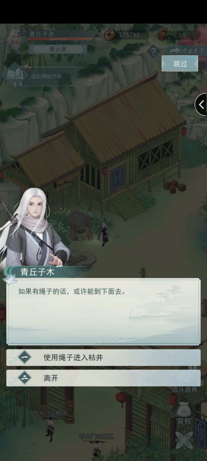 首先是这个井得绳索重置1-7关,获得绳索。然后完成支线往山寨大门走,会遇见小寒,捉蝴蝶会发现那个瀑布下的山洞有把剑-昆吾剑,需要驱虫道具,驱虫道具需前往3-4打败34级17000血的阡陌客可以获得道具,然后在3-8通关后进山洞获取昆吾剑,可以重置再打一次使用道具前往3-6山洞探险