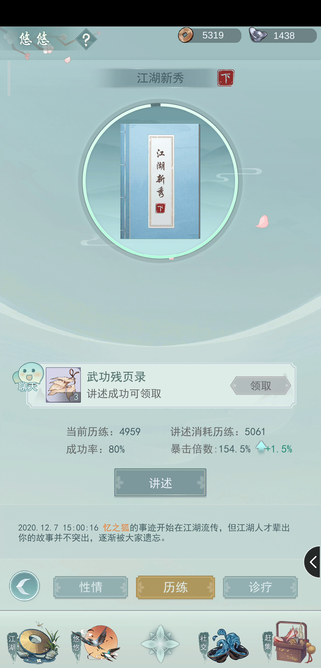 儿子23级,莫思楼功法基本全紫,武功25级以上,3-4阡陌客都打不过呢;还有另一个号人物20级,暗影基本25级以上2-8的18级甲硬是打不下来,不知道怎么回事,网上都说惊涛和问酒的厉害,现在也没足够潜力和突破丹换了,不知道大头可能解答功法之间的机制
