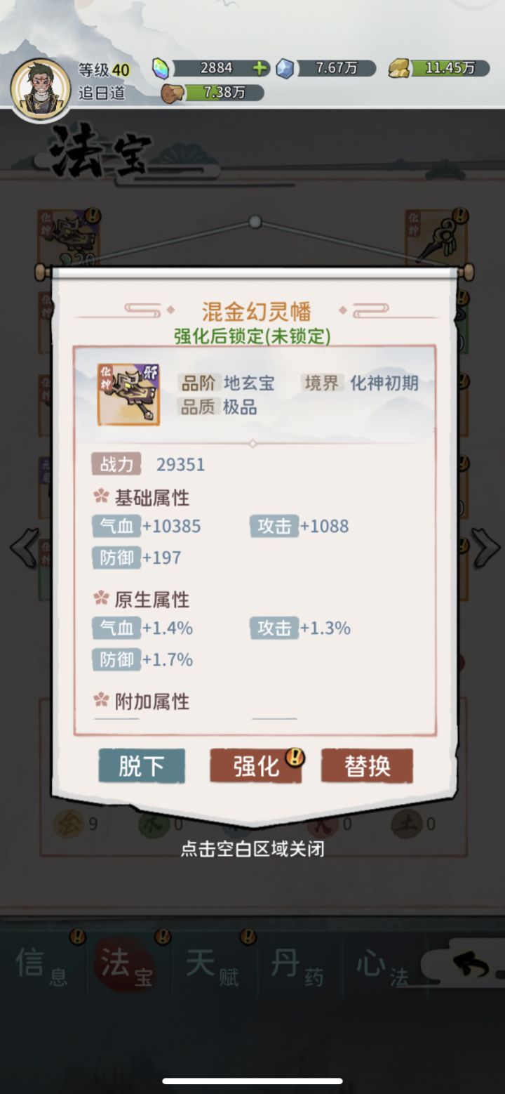 目前图已经清完 350w左右就能把地图怪大部分给清干净 会剩几个比较恶心的双奶需要一直赌脸 月任务随便打阵型大部分采取这个最上面带个土枪 双奶中间输出6个锤 拿个人1.3位置破防土锤 其余锤随便带肉群盾闪避刀群盾最下面3个金幡然后是重点部分 以上的所有装备都可以用化神的 我过图的时候就是全化神装备 没有一件降阶的 输出是掌门1.7w 大师兄2.1w左右所有人一定要有五行 27的破烂化