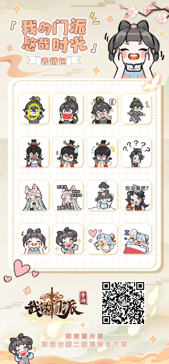 ※「我的门派悠哉时光」表情包现已上线!亲爱的掌门,「我的门派悠哉时光」表情包现已开放下载。掌门前往【微信】扫描以下二维码或前往【微信】-【表情】搜索【我的门派悠哉时光】,即可收获超可爱门派表情包!
