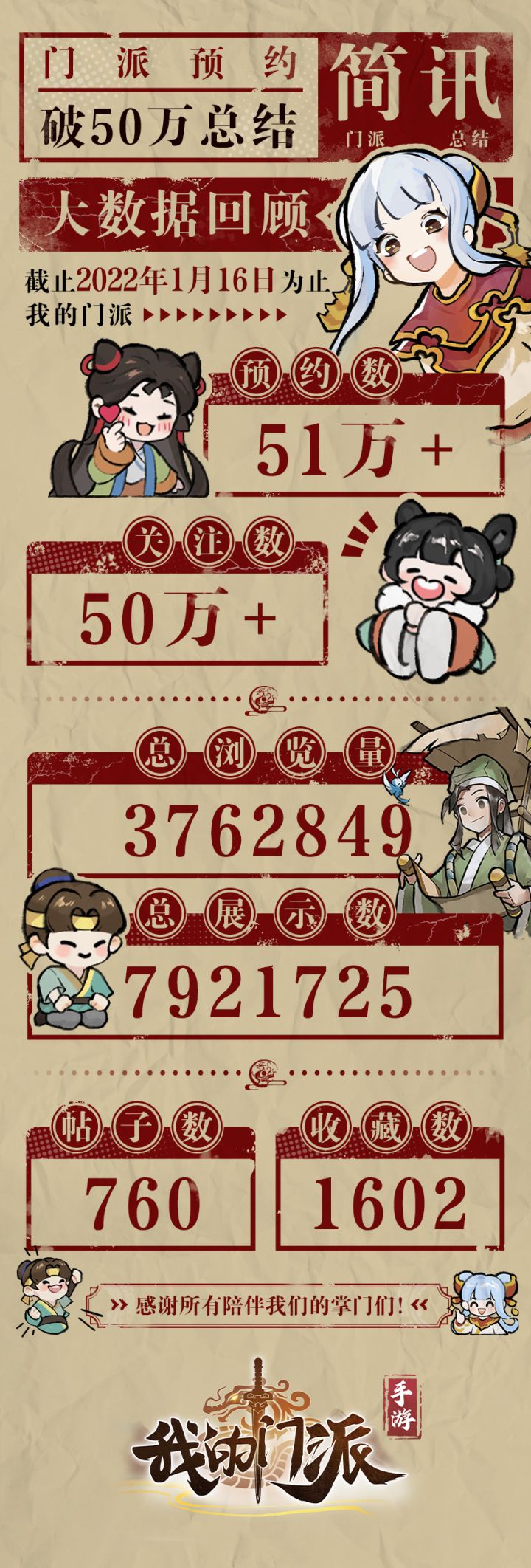 各位掌门们大家好哇ヽ(✿゚▽゚)ノ今天小师妹将带领大家一起看一下《我的门派》预约数据汇总,请各位掌门们查收 (๑•̀ㅂ•́)و✧在定下50万预约数的目标之后,小师妹与其他同门师兄妹曾一度感到压力,惶恐这个任务是否真的能完成。结果总是出人意料的,没想到目标实现的比我们预想的要快很多,这都得多亏掌门们的一路支持与陪伴!非常感谢大家对《我的门派》的支持与喜爱,在大家的陪伴之下,我们也会继续不断打