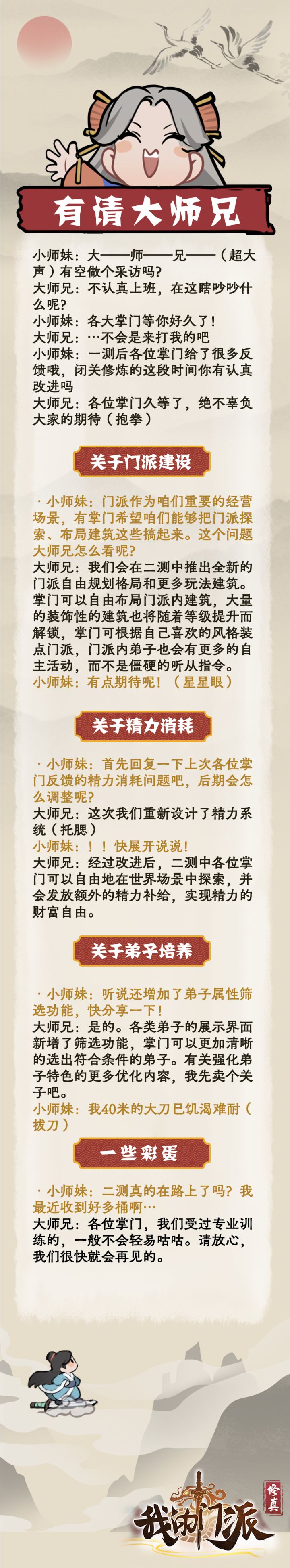 最近感受到各位掌门催进度的情绪异常猛烈,作为大家的小师妹当然要努力整活儿啦!现在!我们决定!将《绝密开发日志》全面升级改版为《有请大师兄》。在这个栏目中,我会和大师兄一起,为大家介绍最新的开发进度,揭秘大家最好奇的问题~今天是第一期《有请大师兄》的正式运营,小师妹和大师兄针对一测中掌门提出的疑问进行答复,分享最新鲜的游戏进度!本期《有请大师兄》就先到这里哟~今后关于《我的门派》的开发进度、