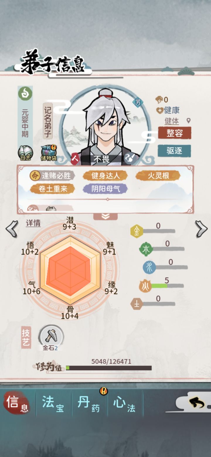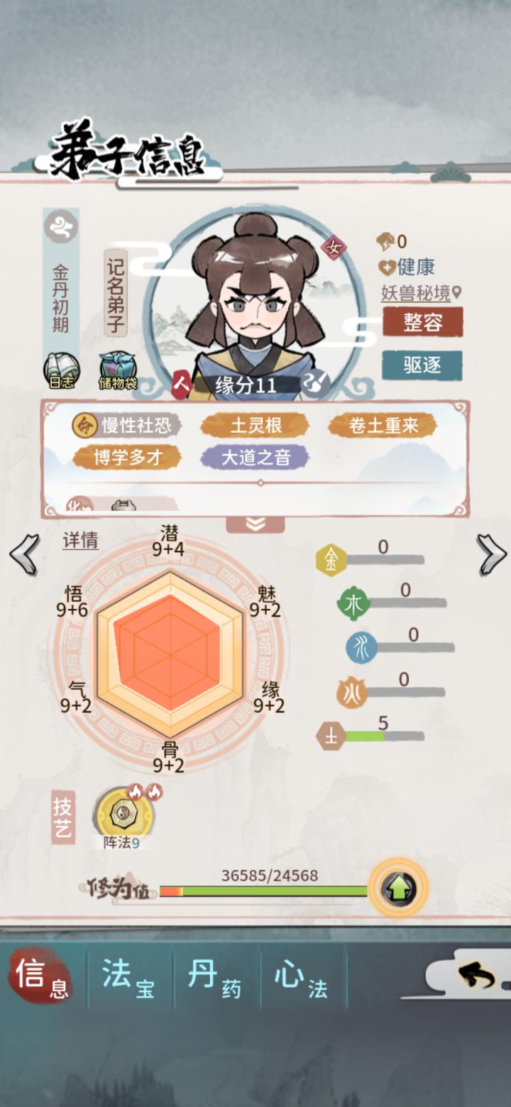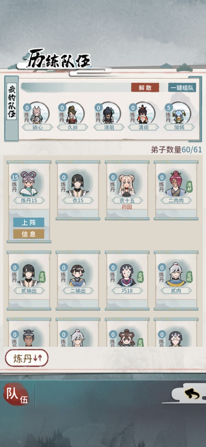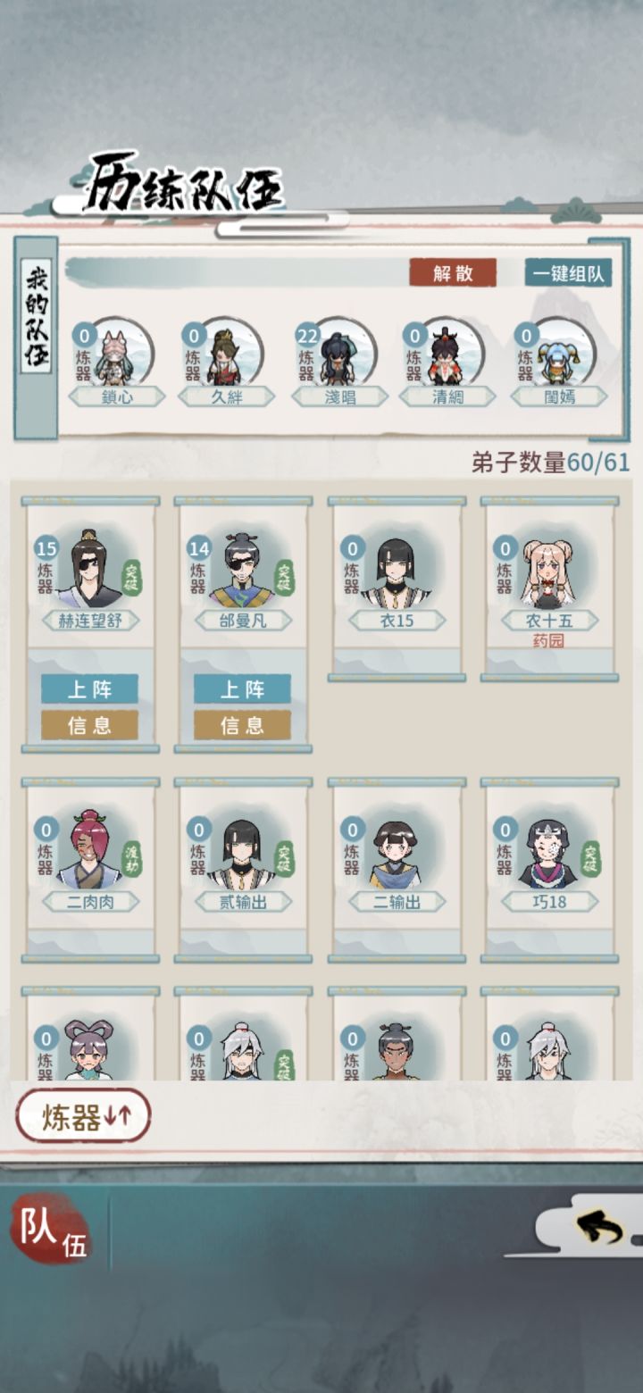 月份做完任务后,把山门弟子全部清空,再点进行下一个月,这样出橙色弟子几率应该比较高一点,本人用三个号做测试比较,一个号清空、一个号清一半、一个号不清;测试结果😂两个月时间清空山门弟子经常出橙色弟子,其他两个号宝图都70、80张了都不敢挖图,因为连一个阵法14以上的弟子都没有。而清空山门弟子号上有6个战斗型弟子、农弟子14以上6个、阵法弟子5个,三个写书给邀月,一本买掉还剩最后一个弟子、炼器弟子5个,3三个写书给掌门、留2个、炼丹弟子1名、巧匠弟子6名,写书3个,留3个、还有一些金石和伐木13以上的多名。不知道,这个方法对大家有没有用,只不过,浪费点时间,月份结束前把山门清空而已。这方式希望能帮助大家,如不能也请多多包涵,我也不知道其他号怎么样,游戏而已图一个开心。