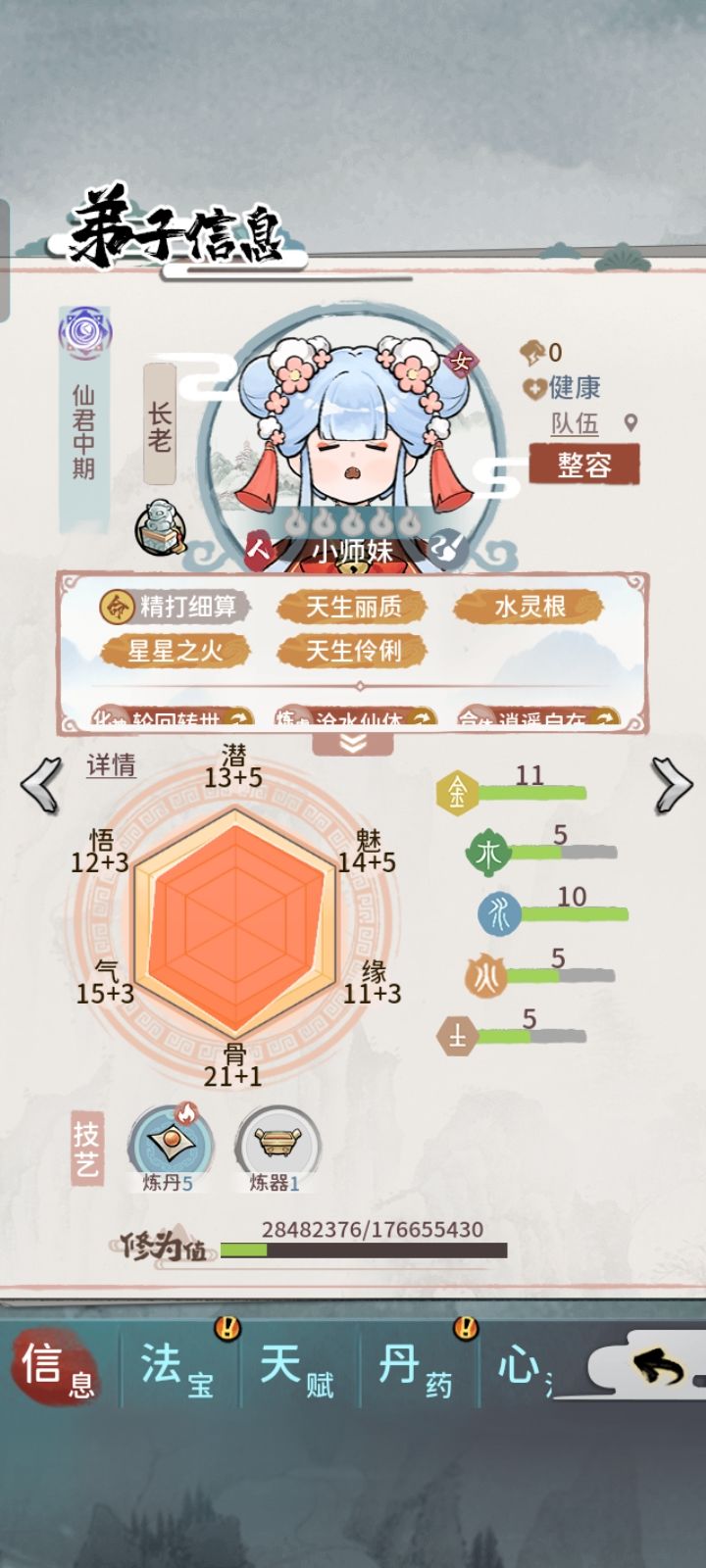 一.开局天赋1.掌门先天灵脉+武道巅峰,大师兄出神入化+五行契合 毕业选择平民不推荐(开局要开出炼器弟子比较麻烦,而且新区炼器书很贵)2.掌门先天灵脉+炼器,大师兄出神入化+五行契合平民推荐,最终还是会转天命为毕业选择(游戏里68r,以前活动送过),掌门当肉,大师兄输出3.掌门武道巅峰+炼器,大师兄出神入化+五行契合平民推荐,最终还是会转天命为毕业选择(游戏里68r,以前活动送过),掌