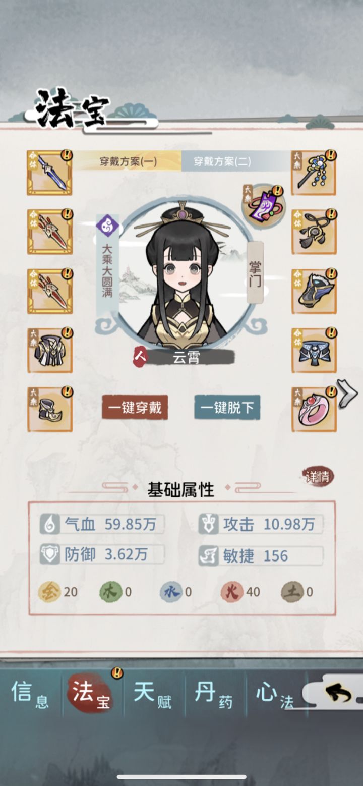 配置要求器灵:蛊术,带减疗效果。这个很重要,缺这个东西,非常难受。第一轮没秒杀掉,BOSS一下回血90万,怎么玩?但没有蛊术也不是不能过,你就要按照我下面的配置来操作。武器:一共6把金剑 20五行+7.8穿透。3把火剑。火剑按图片做。火剑的附加属性也可以根据弟子面板来调整,只要达到要求基本上秒过。阵法站位:上下路双前排,主肉站上路,副肉下路 中路站3人输出。中路第一位上掌门,掌门挨揍靠暴击