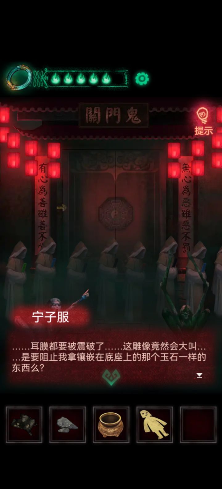 |||第四章:回门[城隍庙]1.进入城隍庙。点击拾取【灯笼】2.点击供桌,获得【空香炉】3.查看《阴世录》内容……✄……✄……✄……✄……✄……[城隍庙外]4.把【灯笼】挂在路边的架子上5.点击进入左侧草丛,获得【燧石】6.再往里走,获得【墨块】7.点击城隍庙外左侧的桌子,打开上层抽屉,获得【毛笔】8.点击右侧桌子,在碗里获得【面团】;查看桌子上的纸条9.用【空香炉】盛
