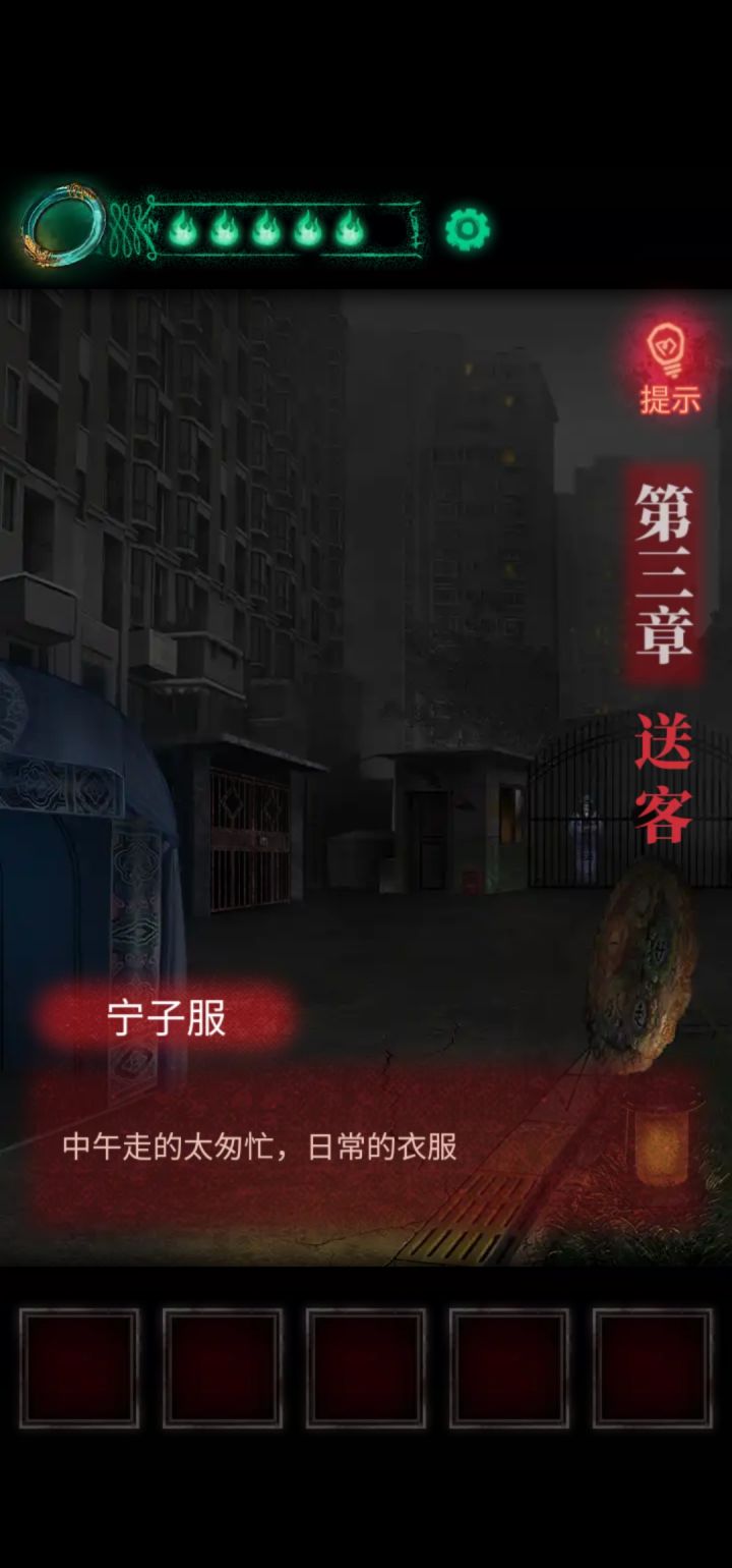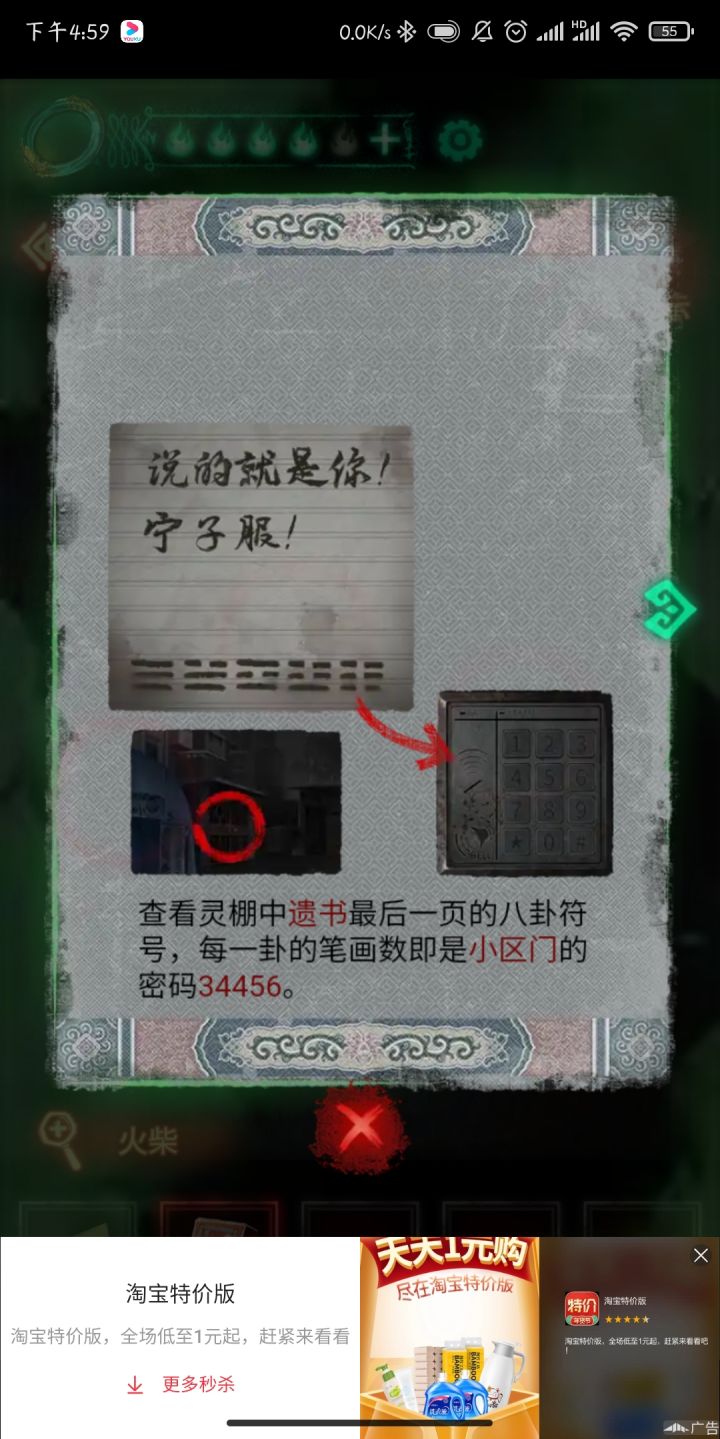 大概玩了两个小时吧,画风挺好,背景乐真的强,第三章的四楼老爷爷真的吓到我了。粗略的来做一次攻略吧,图片没截完整。有点乱。第一章:托盘里面有撕碎的钱,要用浆糊粘着拼起来,得到了要塞进红包给小孩。找到蜡烛要放进灯笼然后用火柴点燃会出现字,按照字翻书得到密码。527139叭叭叭省略第二章老奶奶和小孩子是关键箱子←2下 →2下 ←4下第三章要给四楼老爷爷烧美女和马,要用符给假道士得到手机和空