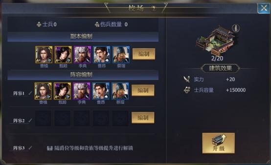 校场好好利用好编制阵容,国战副本快人一步一、校场可以编制阵容,方便在国战或副本中快速上阵武将,二、提升爵位或者VIp等级可以编制更多数量,上限为10个三、升级校场还可以提高主城士兵容量