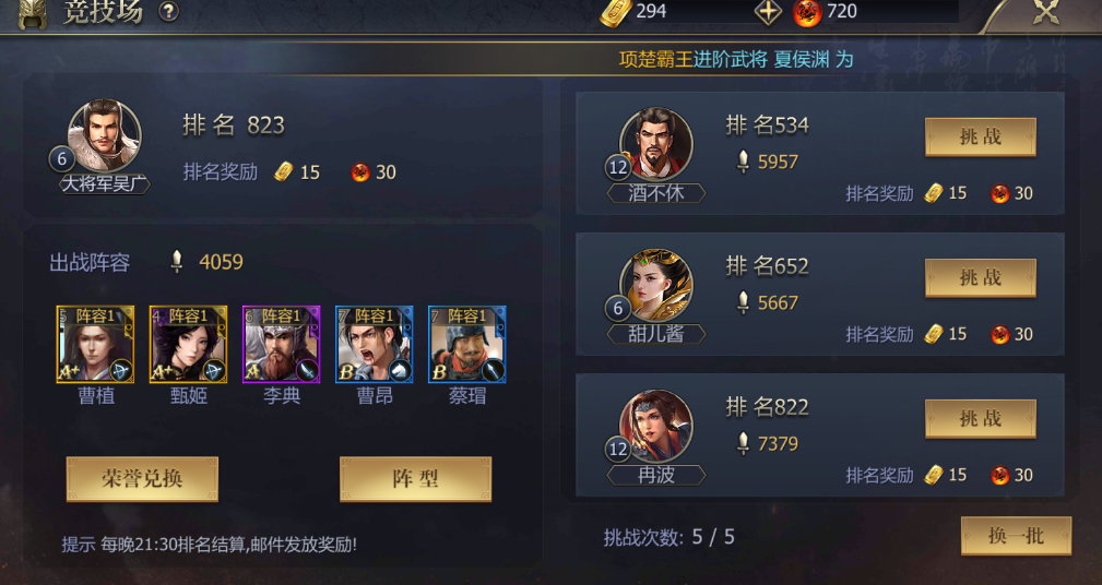 作为每日一项重要活动,12:00-22:00为开放时间1、 没命玩家可以从列种中选择武将阵容,列表会每日刷新,保证公平2、 每日都会有2个主体国家中随机出武将进入选择列表3、 个人在招贤馆解锁的武将也可以出现在列表中4、 开动脑筋,排兵布阵,每一个技能都释放合理即可击败对手,升到更高的位置