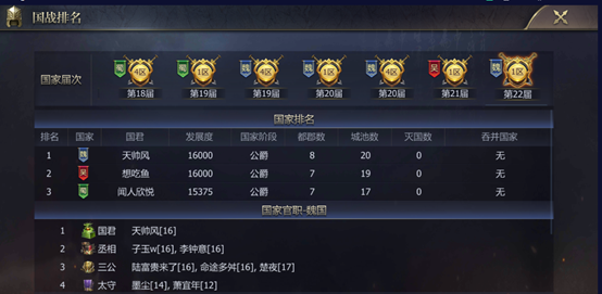 想知道哪个国家强,看一下国战排名建筑就知道了,里面有每个赛季的国家排名和得分情况: