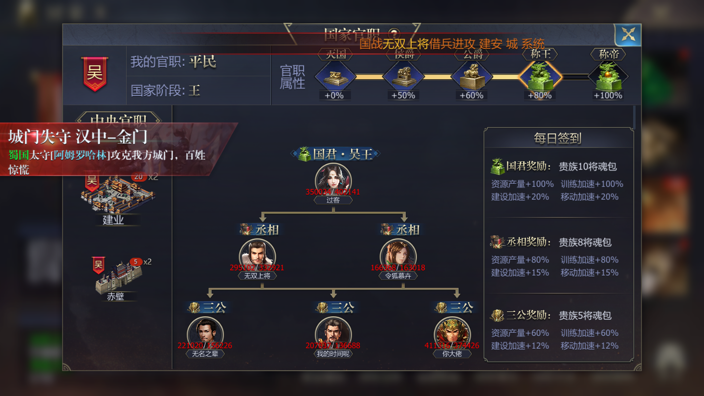 进游戏早,一下子就申请了个三公,能干的事真不少,在【国家行政】界面城池设郡后,就可以提供更多官职,让小伙伴们都有官当。