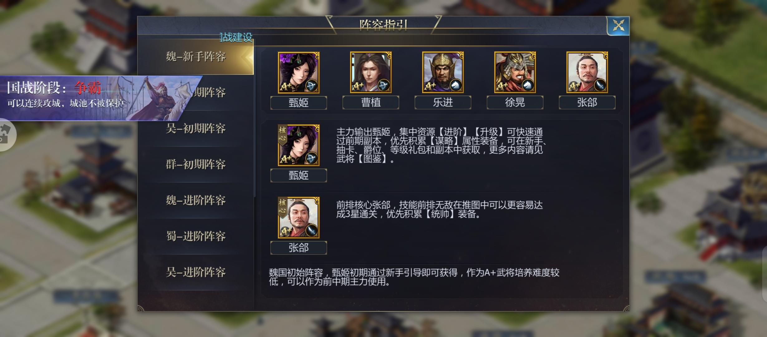 新手玩家可以看看推荐阵容,看看有没有自己喜欢的阵容和想要培养的武将,阵容入门必看